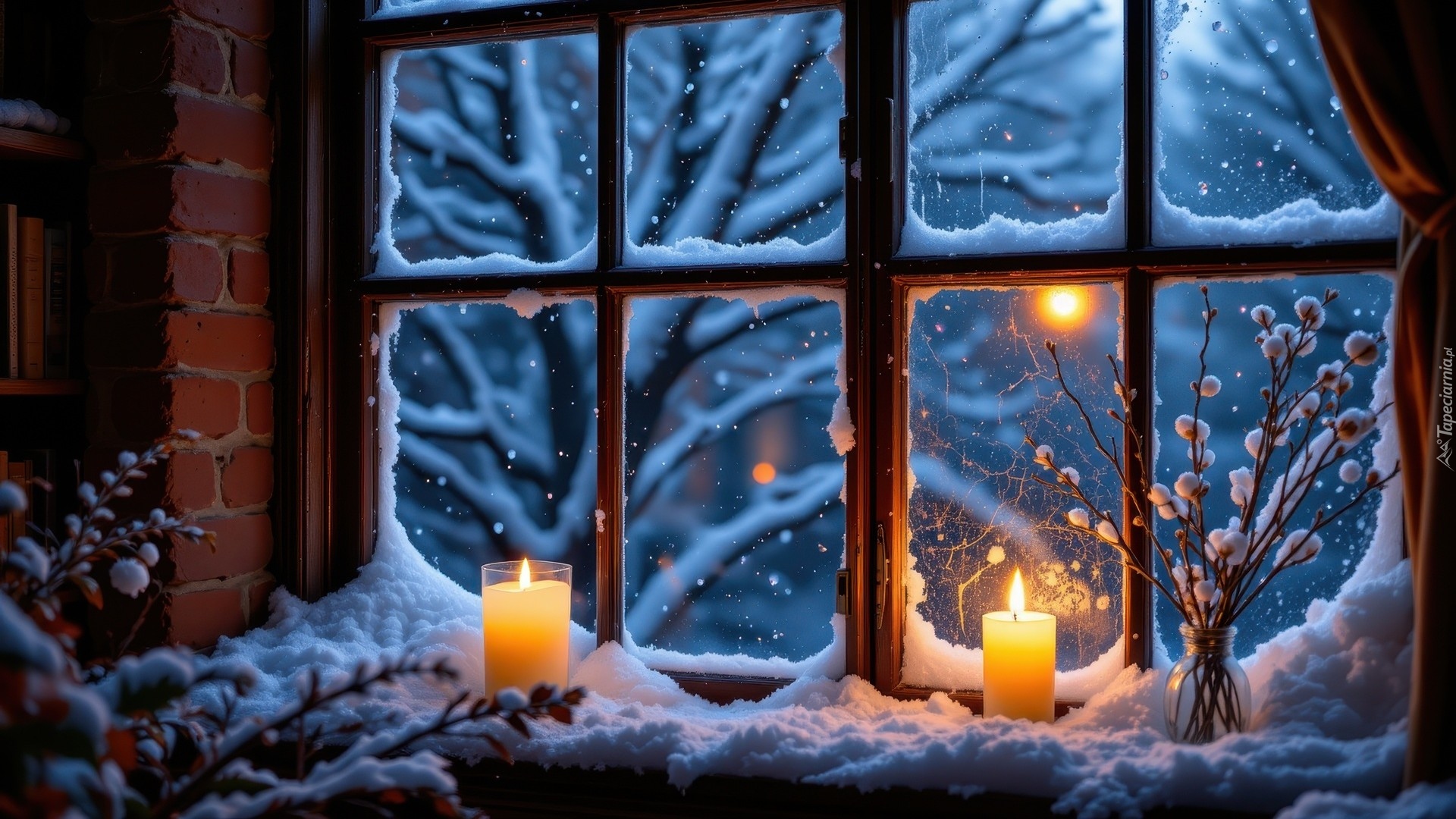 Edytor tapety: Dwie świece i wazon na zaśnieżonym parapecie okna