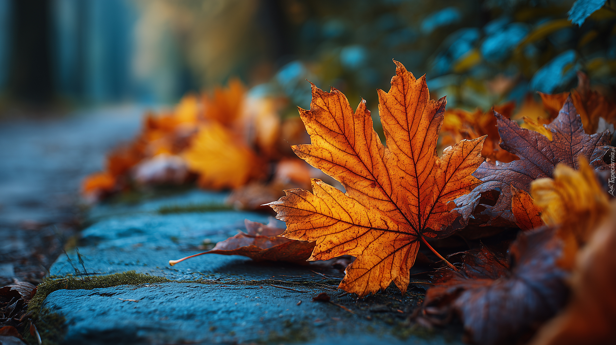 Edytor tapety: Pożółkły jesienny liść klonu leżący na ziemi