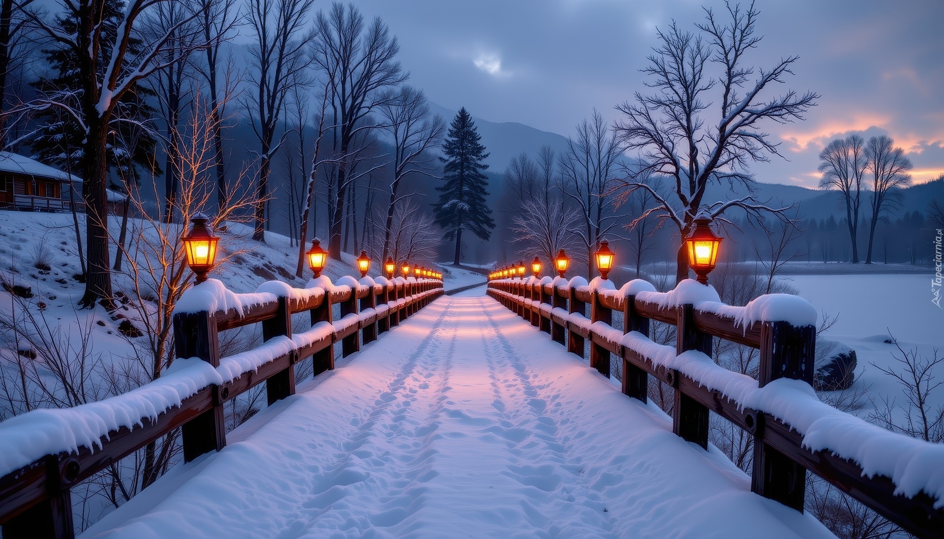 Edytor tapety: Ośnieżony most z zapalonymi latarniami