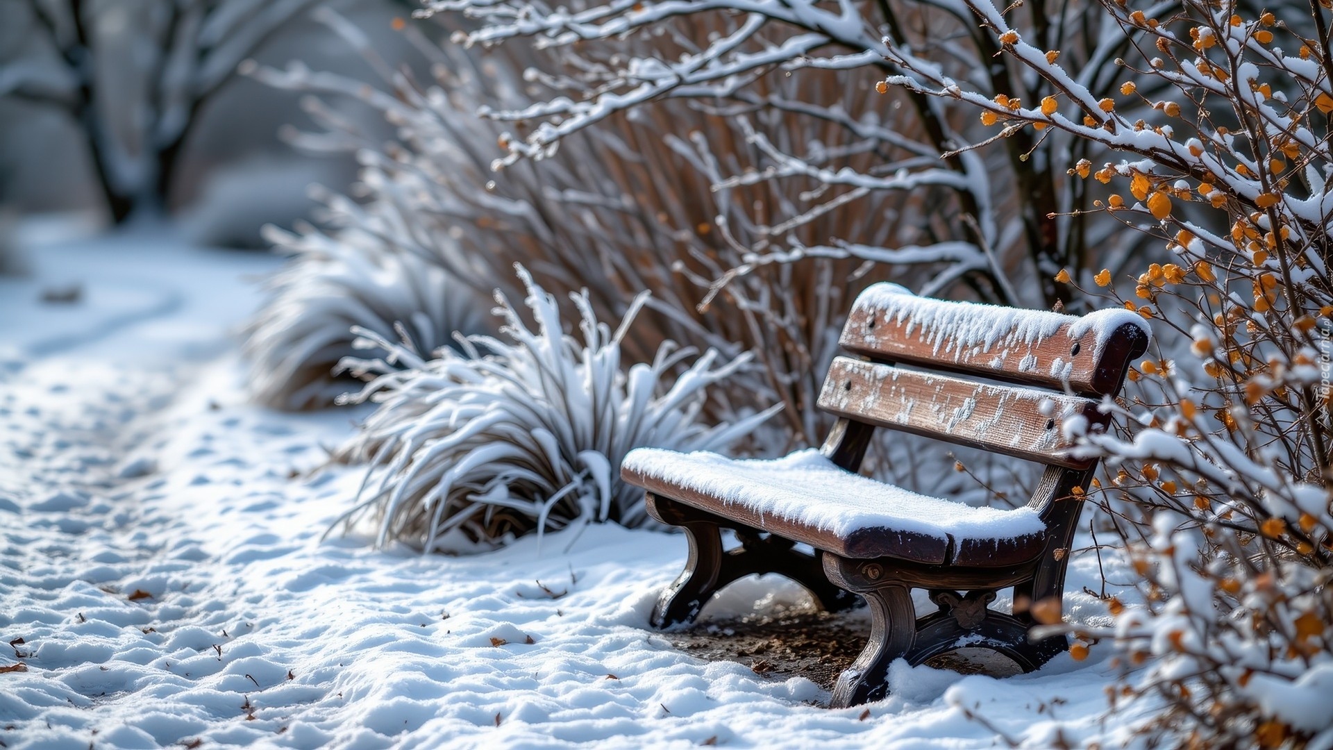 Edytor tapety: Ośnieżona ławka pod ośnieżonymi drzewami