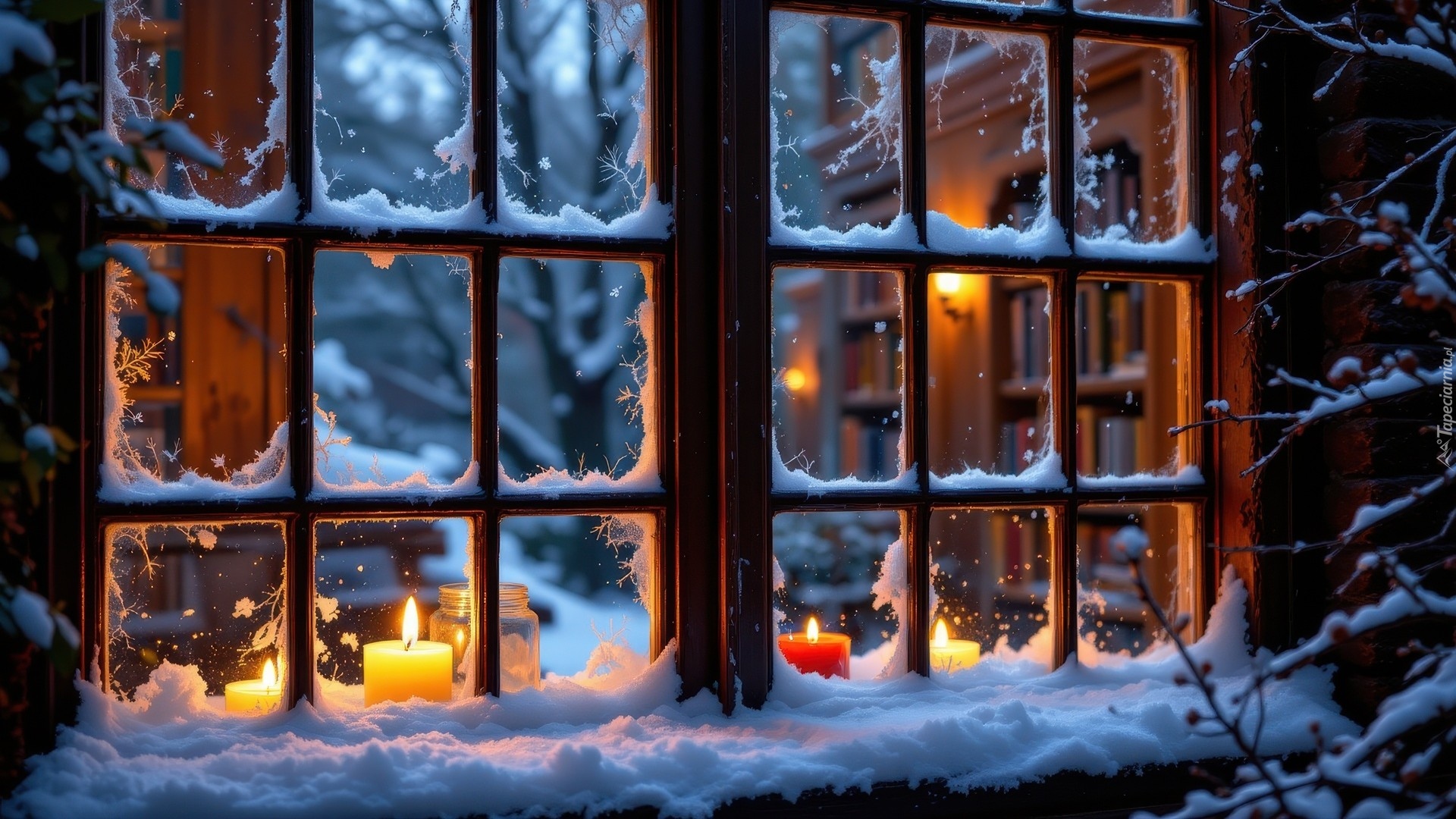 Edytor tapety: Zapalone świece na ośnieżonym parapecie okna