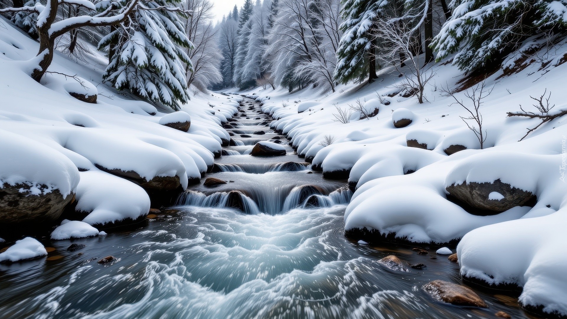 Edytor tapety: Śnieg na kamieniach przy rwącym leśnym potoku