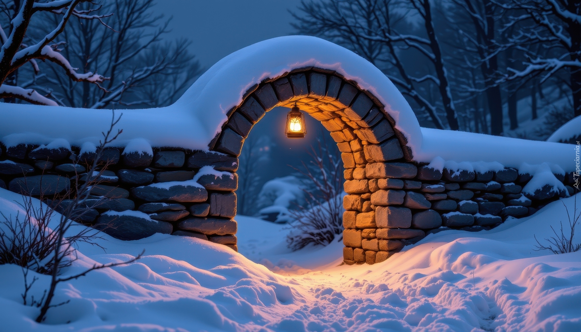 Edytor tapety: Zapalona lampa w ośnieżonym łuku skalnym