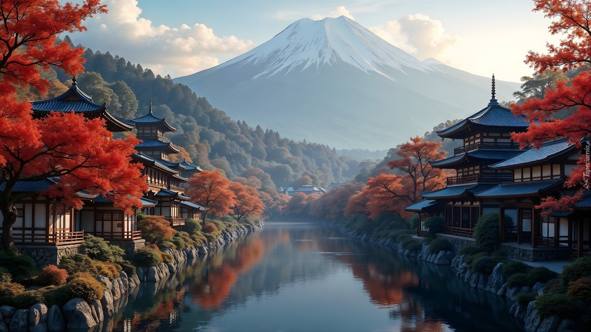 Edytor tapety: Widok na japońskie domy na tle góry