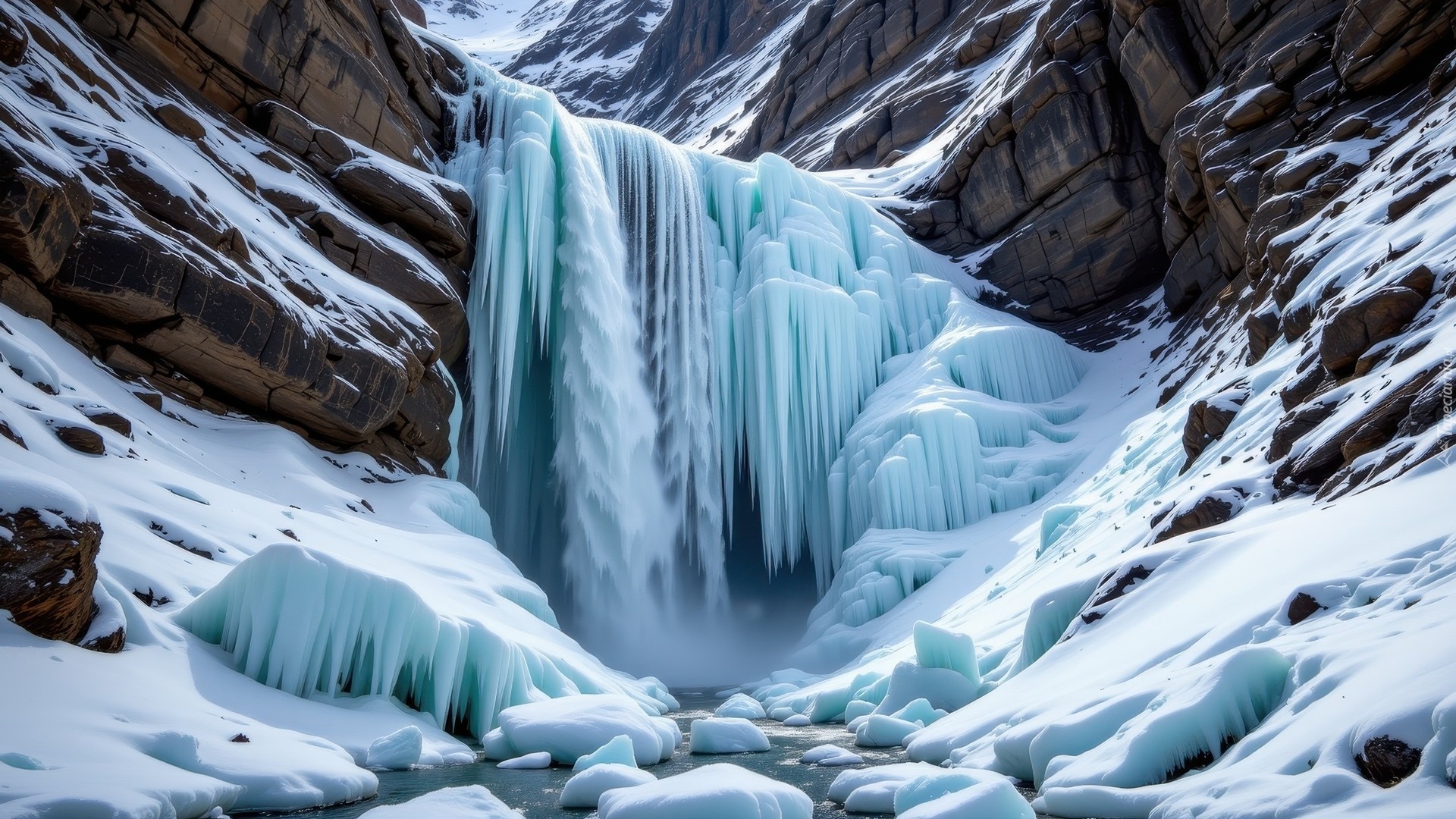 Edytor tapety: Sople na oblodzonym wodospadzie na skałach