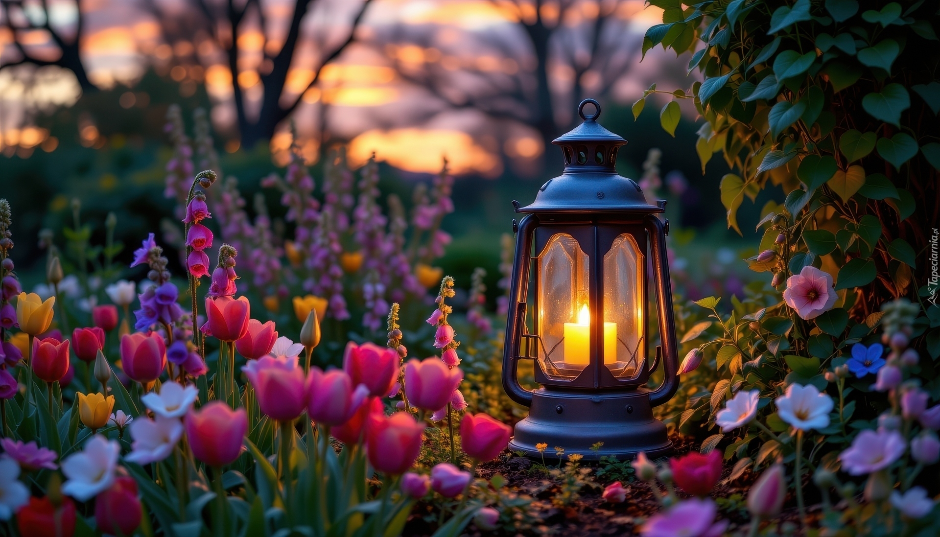 Edytor tapety: Zapalony lampion wśród kolorowych kwiatów