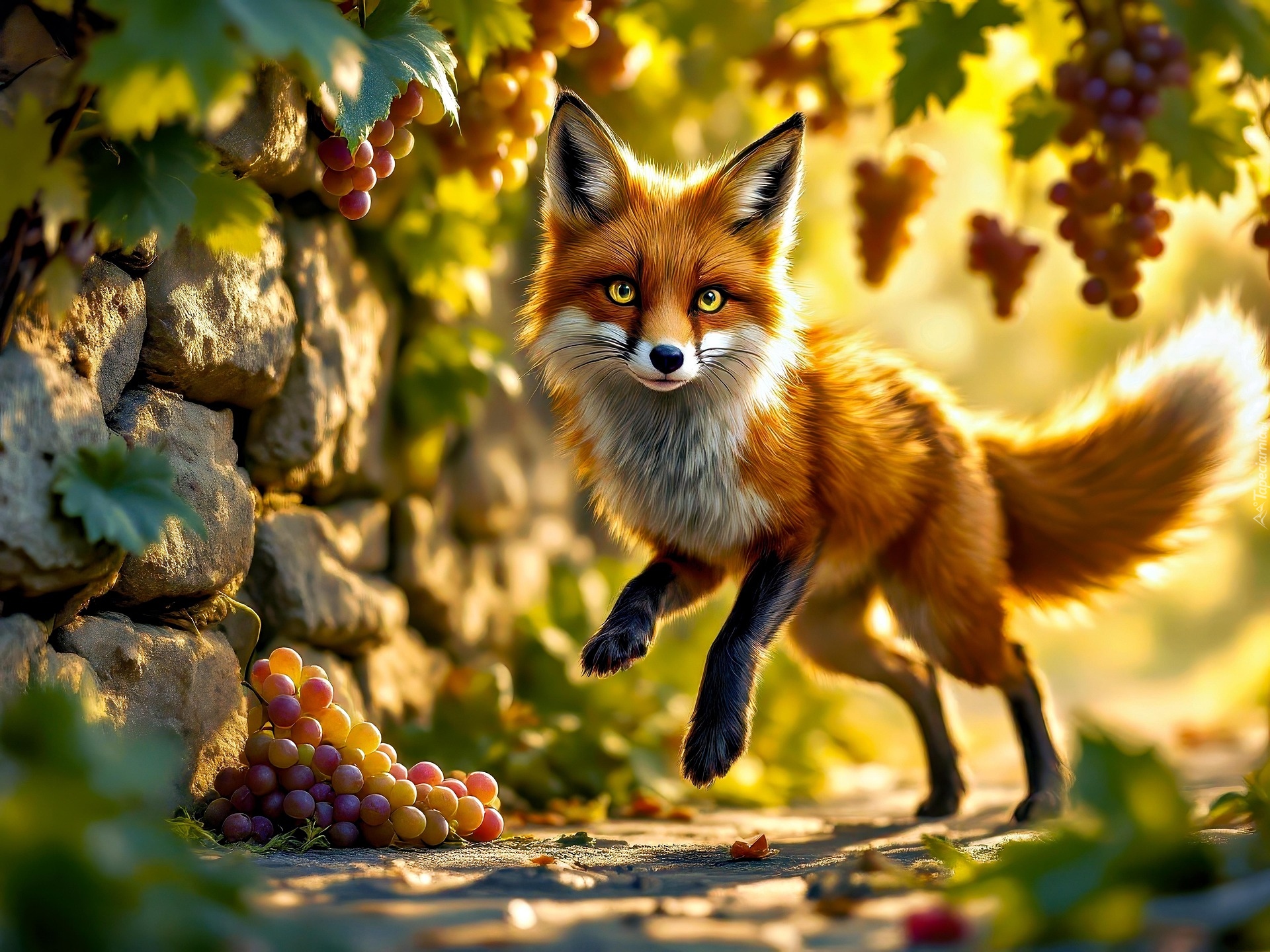 Edytor tapety: Biegnący lis pod winogronami na gałązkach