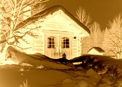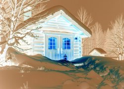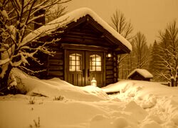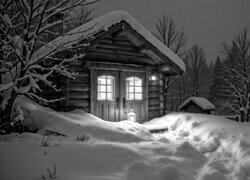 Edytor tapety: Zapalona latarnia przed oświetlonym domem w zimowej scenerii