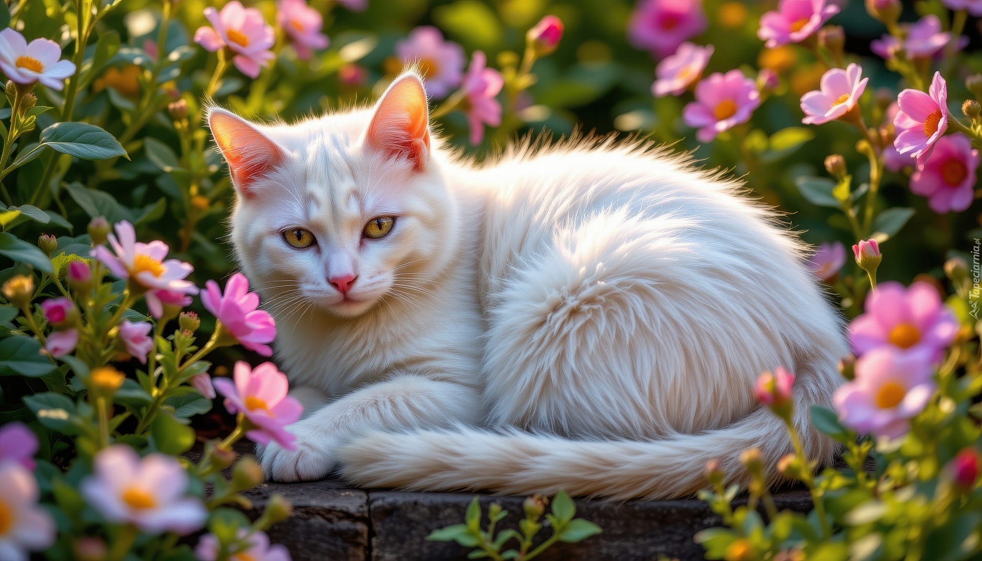 Edytor tapety: Biały puszysty kot na murku w otoczeniu kwiatów