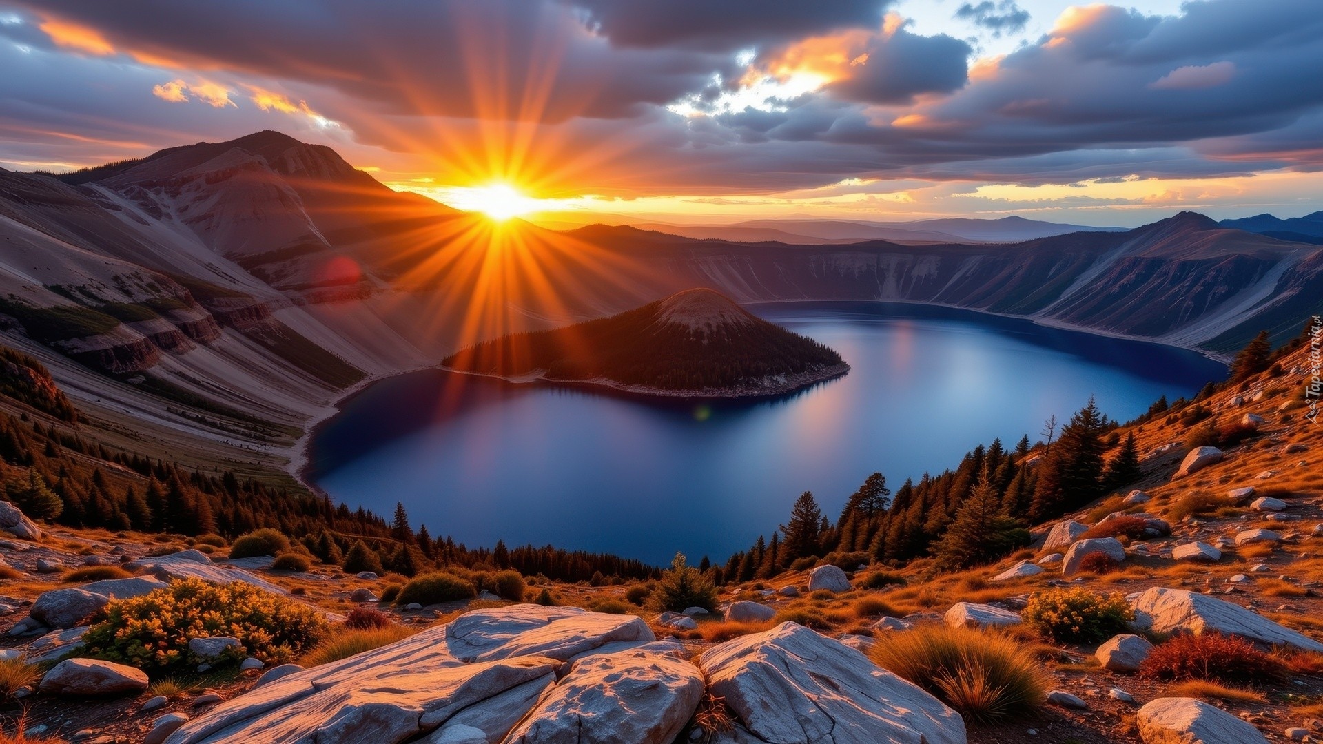 Edytor tapety: Wyspa na jeziorze i zachód słońca nad górami