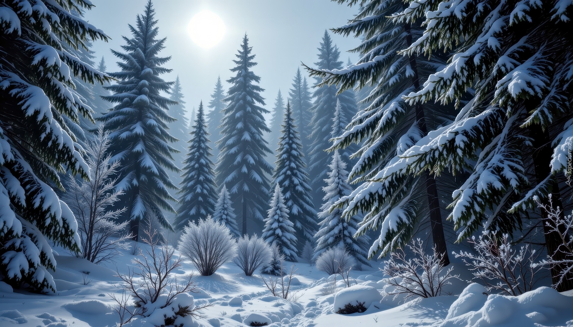 Edytor tapety: Zimowy las w blasku zamglonego słońca