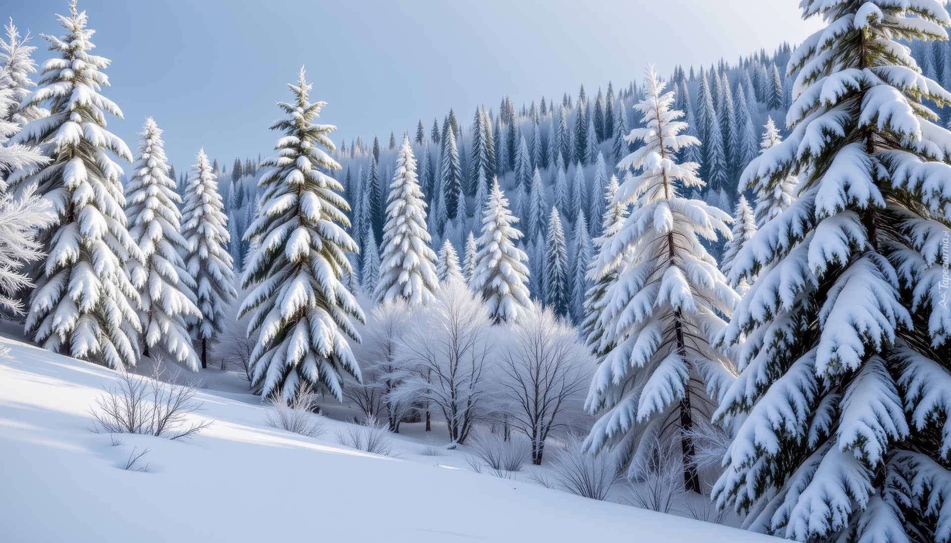 Edytor tapety: Ośnieżony las iglasty na zboczu wzgórza