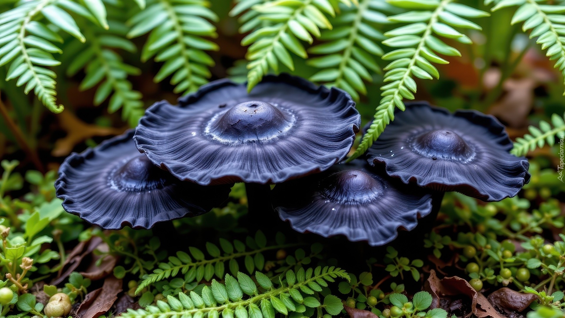 Edytor tapety: Czarne grzyby pod liśćmi paproci