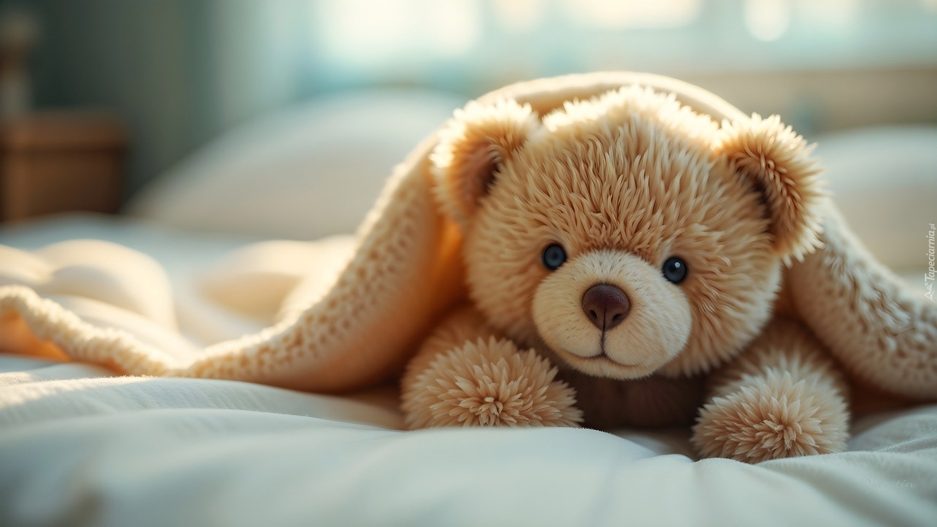 Edytor tapety: Pluszowy miś leżący pod kocem na łóżku