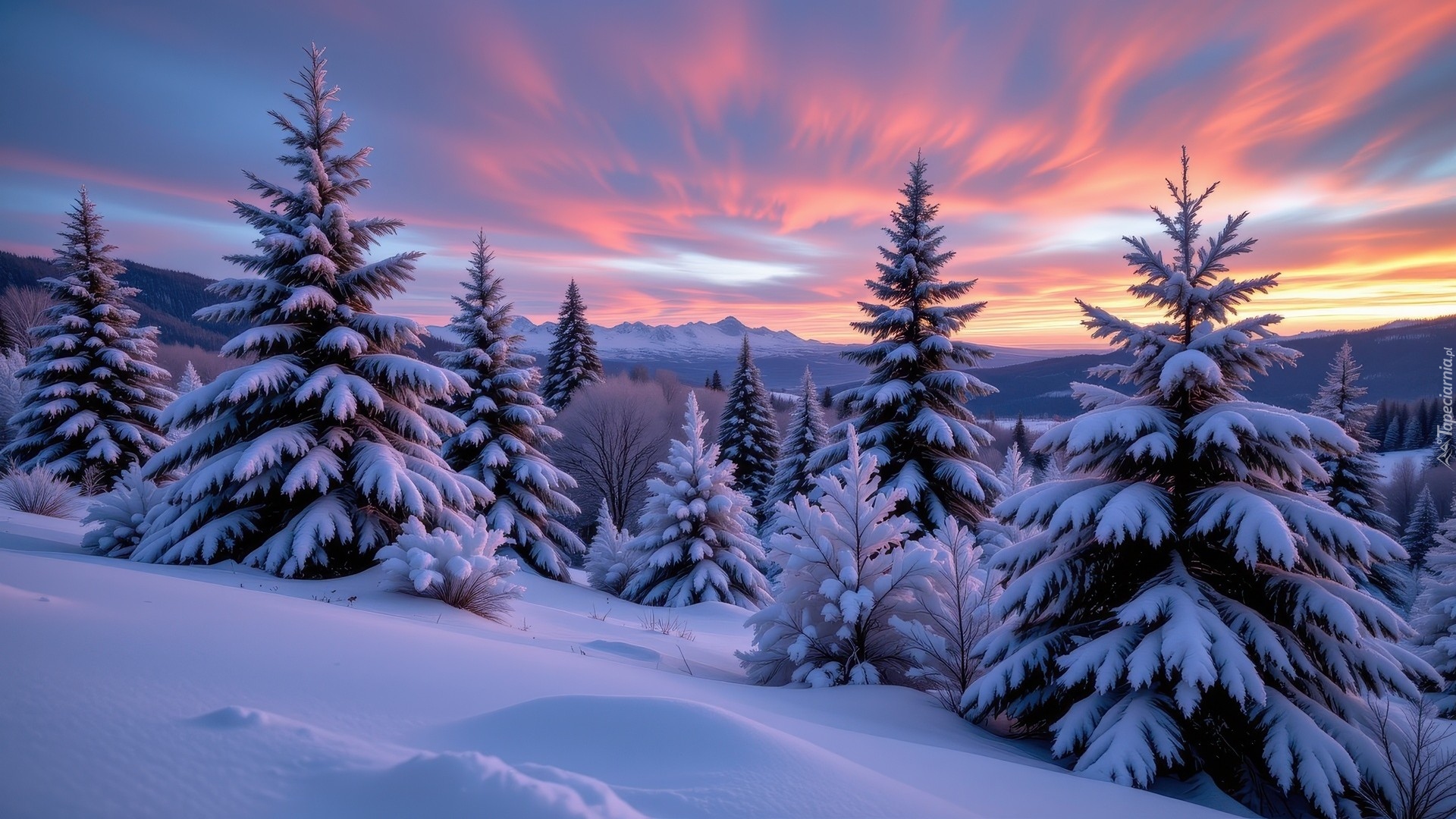 Edytor tapety: Ośnieżone drzewa na zboczu o wschodzie słońca