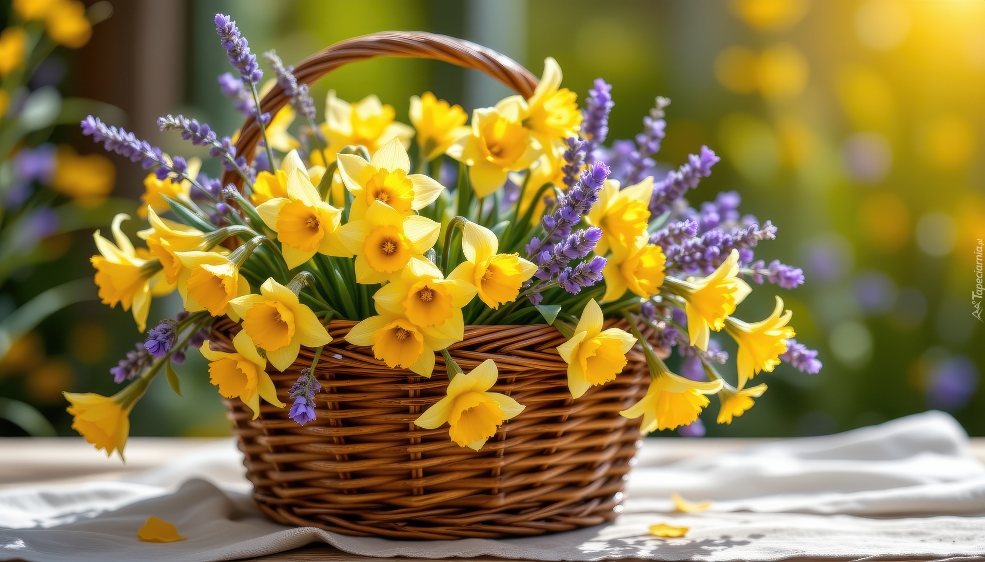 Edytor tapety: Narcyzy żonkile i lawenda w wiklinowym koszyku