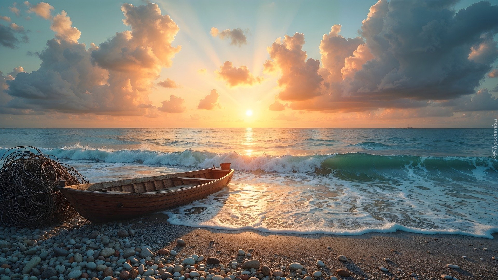 Edytor tapety: Łódka na brzegu morza na tle zachodu słońca