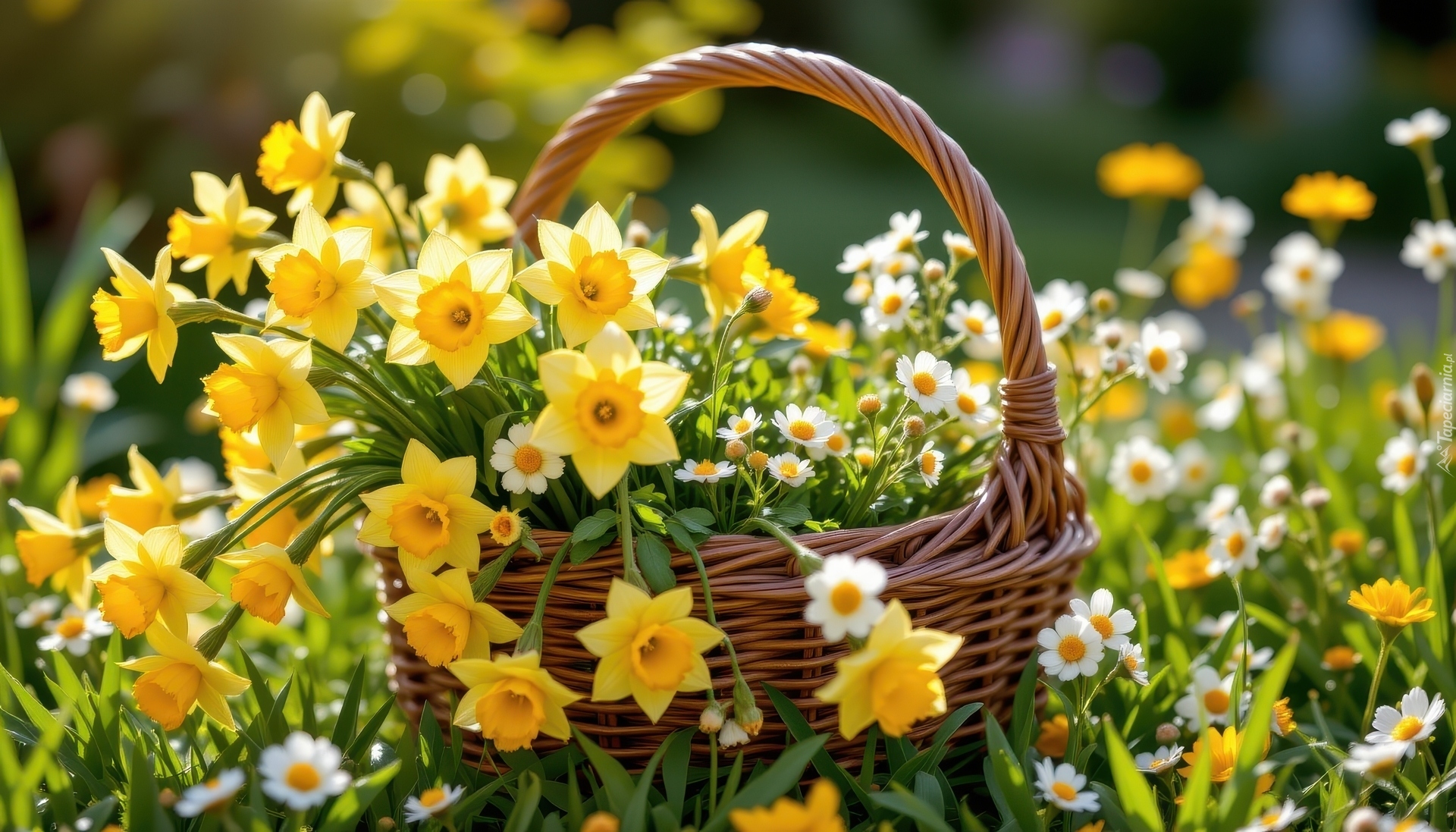 Edytor tapety: Wiklinowy koszyk z narcyzami żonkilami wśród stokrotek