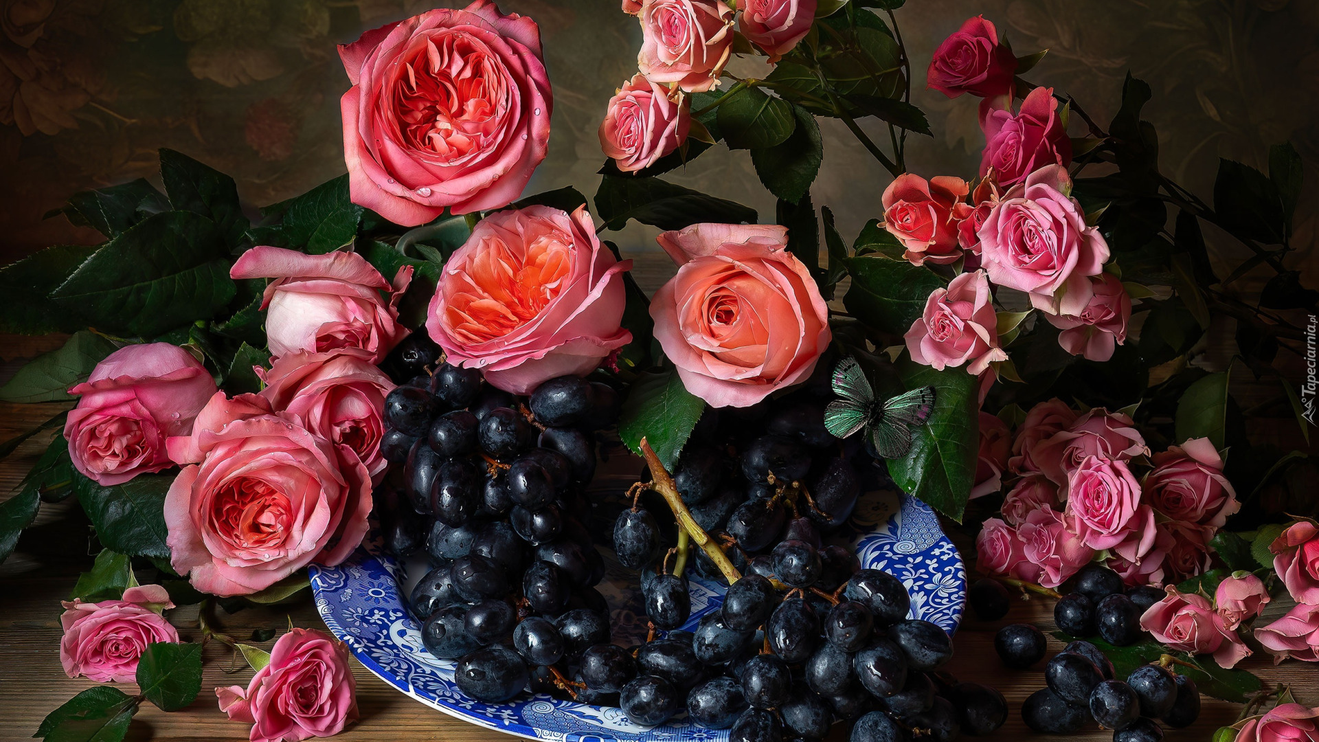 Edytor tapety: Różowe róże i ciemne winogrona na talerzu