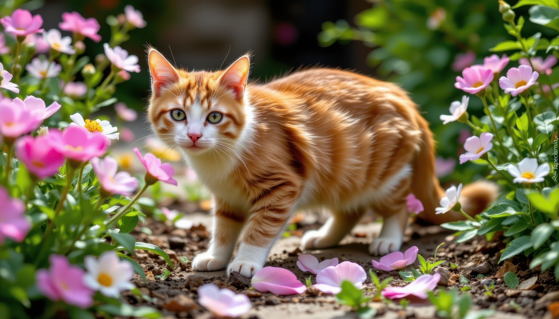 Edytor tapety: Rudo-biały kot stojący obok różowych kwiatów