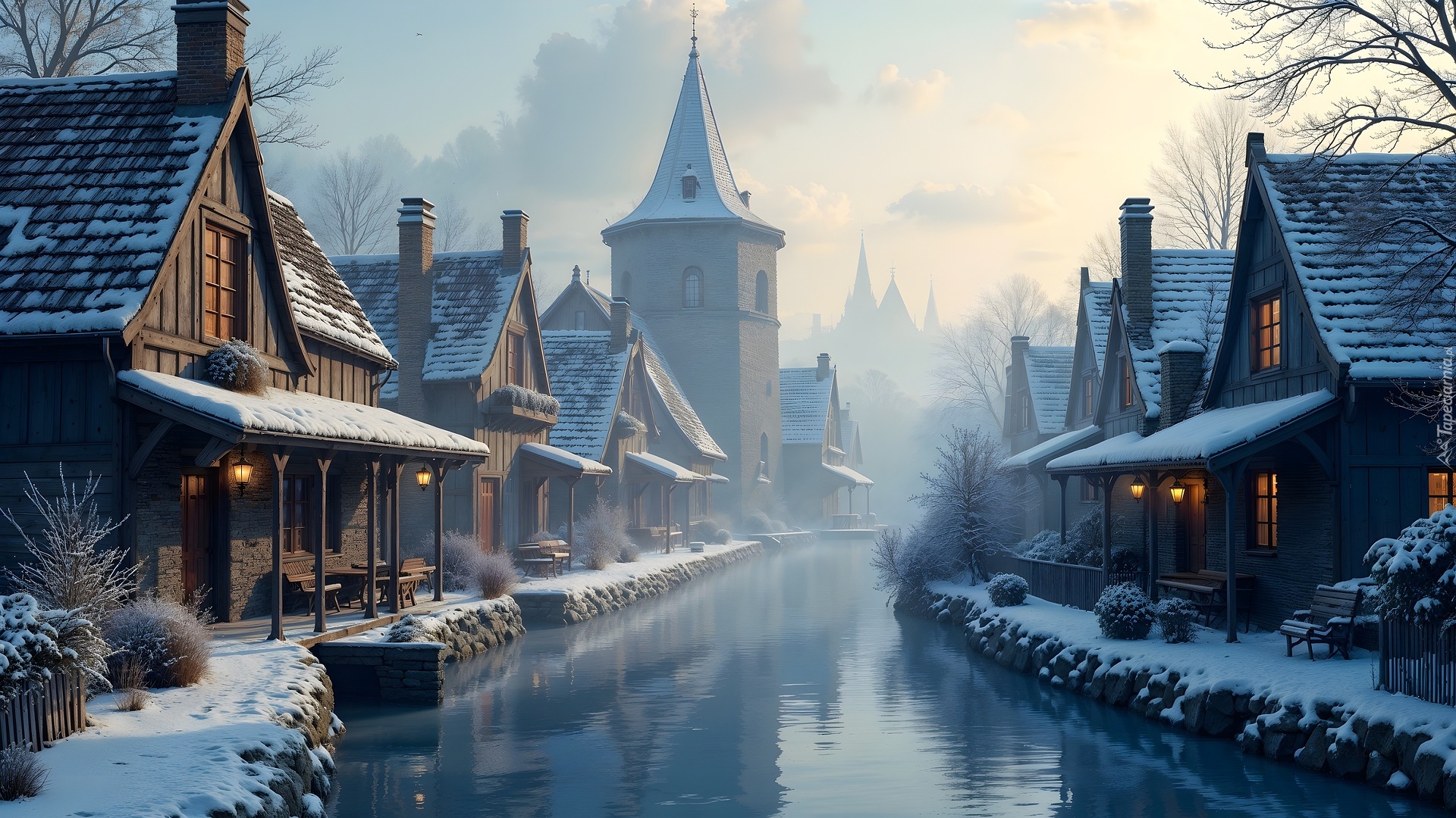 Edytor tapety: Ośnieżone i oświetlone domy przy zamglonym kanale