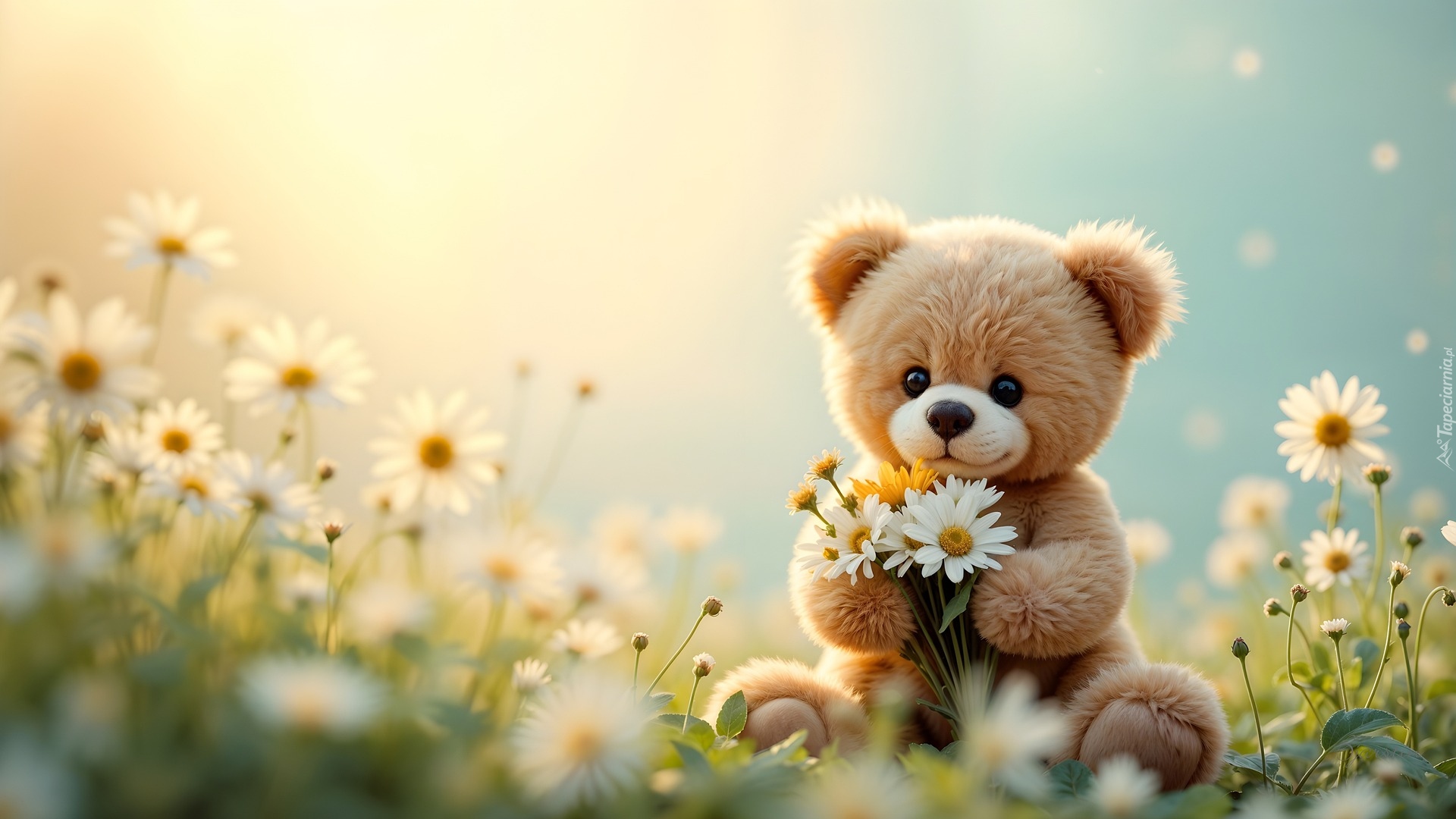 Edytor tapety: Siedzący miś z kwiatami w łapkach