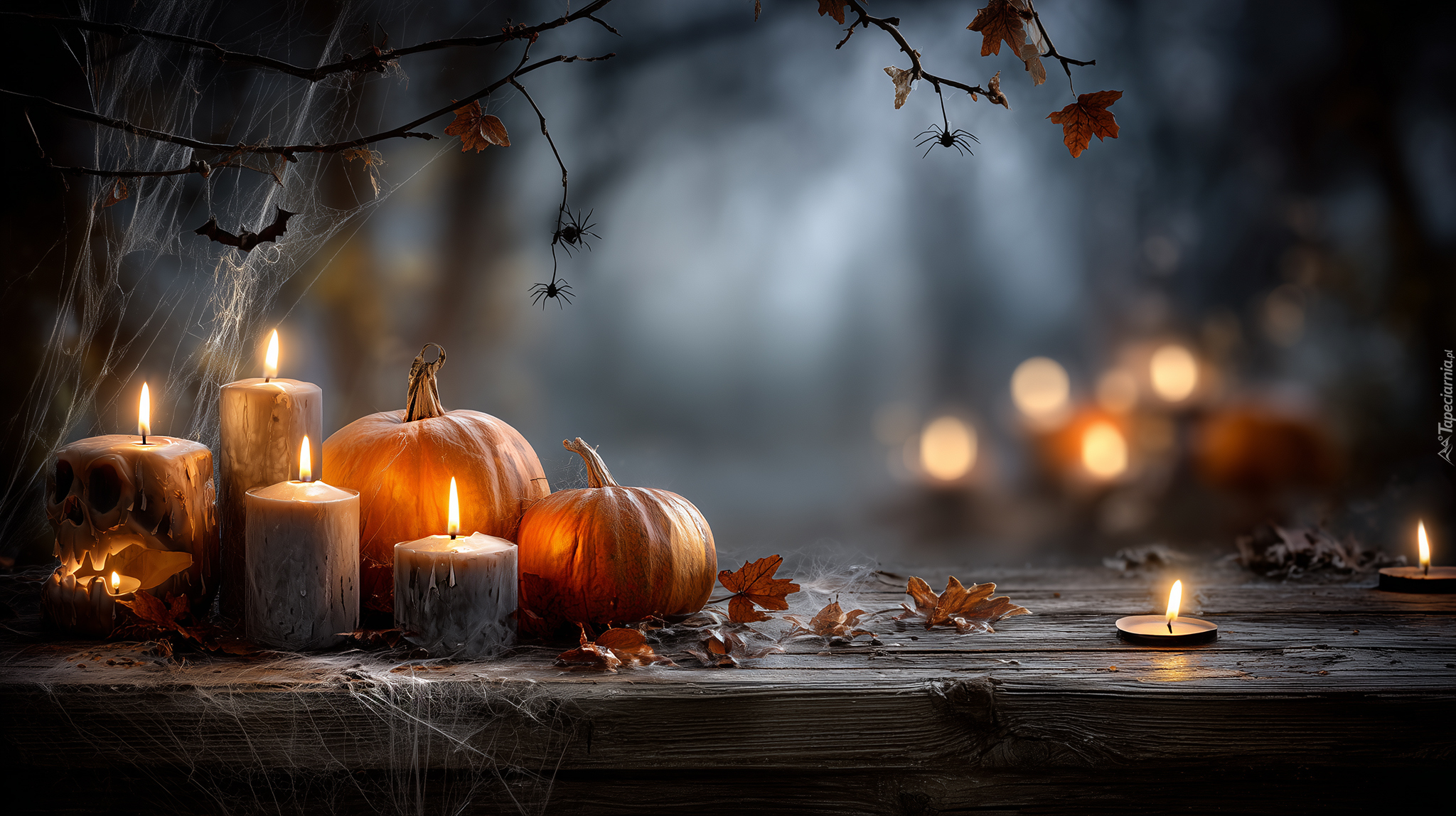 Edytor tapety: Pajęczyna nad dyniami i zapalonymi świecami na deskach