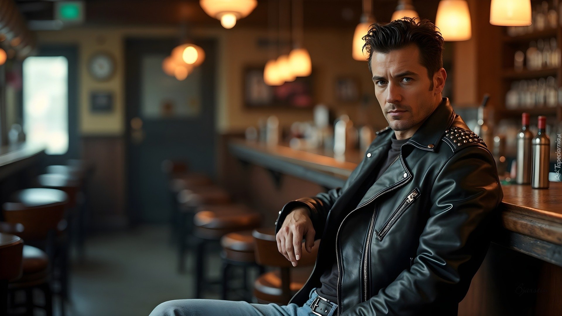 Edytor tapety: Mężczyzna w skórzanej kurtce w barze
