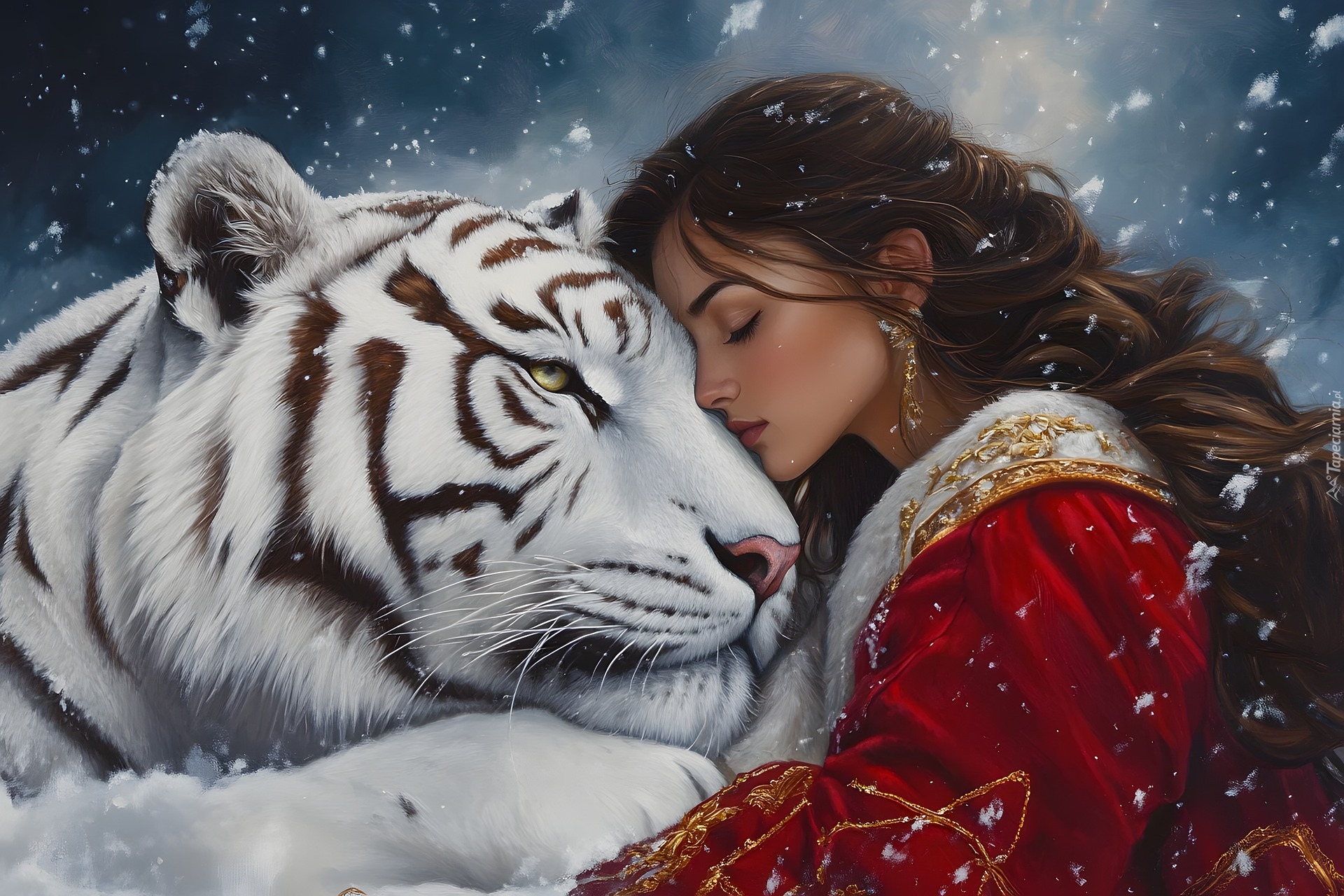 Edytor tapety: Długowłosa dziewczyna w czerwonym płaszczu z białym tygrysem