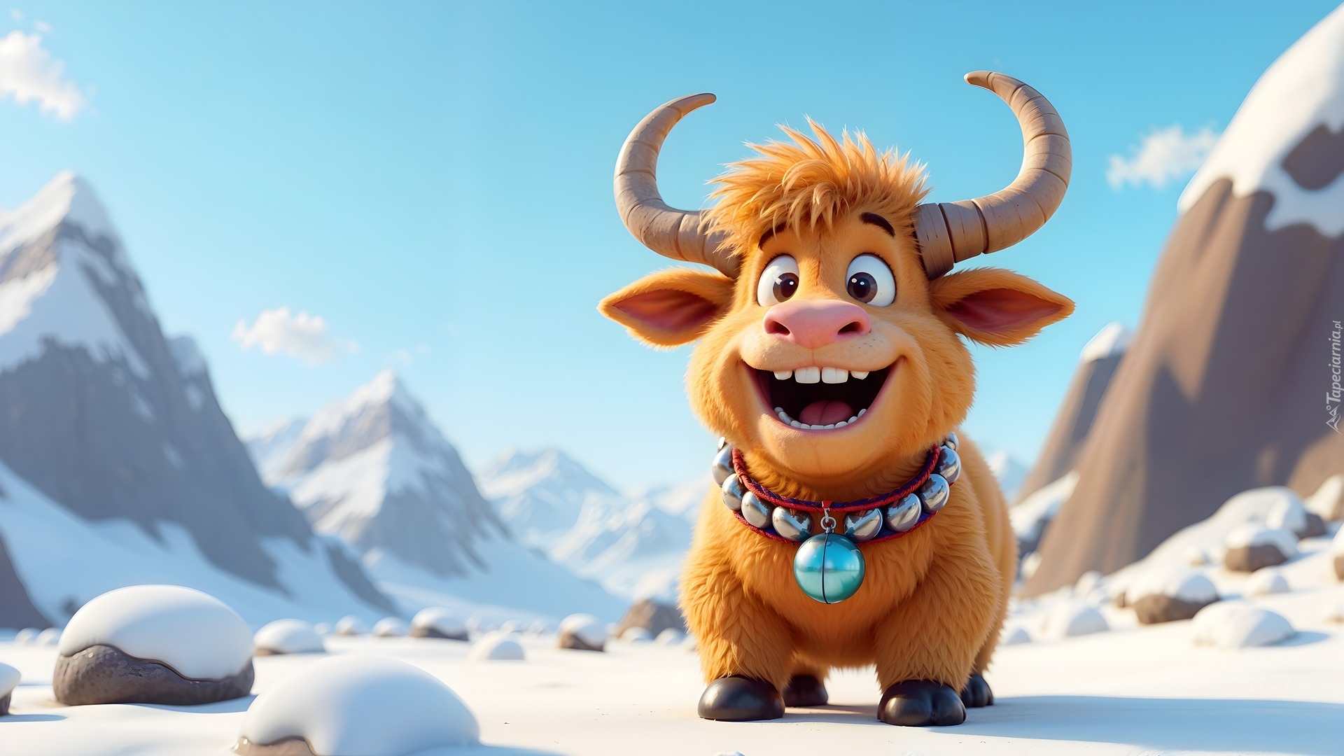 Edytor tapety: Wesoły jak na śniegu na tle gór