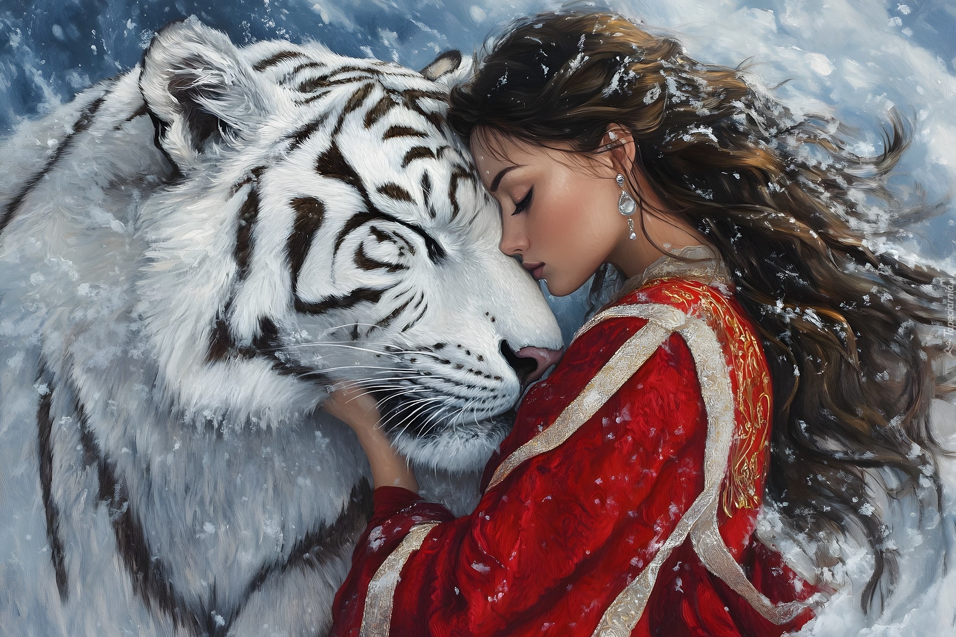 Edytor tapety: Długowłosa szatynka i biały tygrys w padającym śniegu