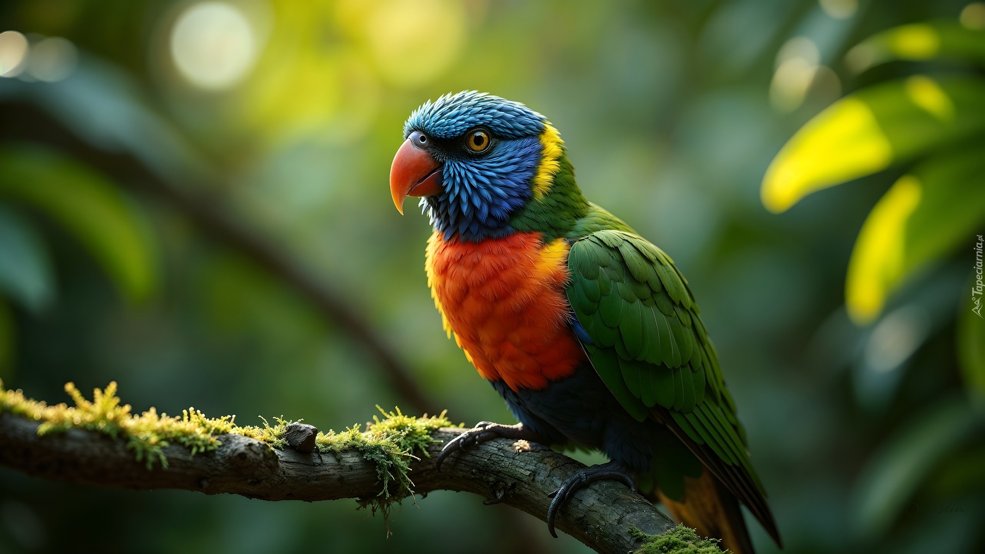 Edytor tapety: Kolorowa lorysa górska na omszałej gałęzi