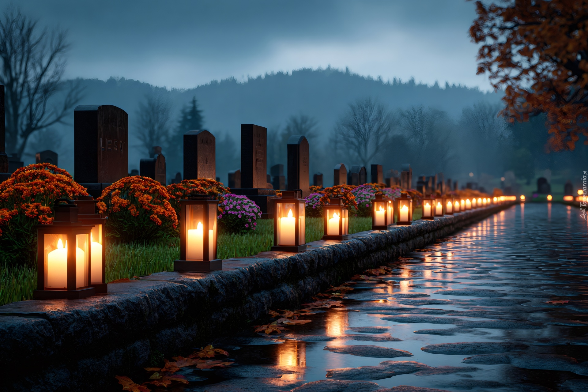 Edytor tapety: Zapalone znicze i kwiaty przy grobach na cmentarzu