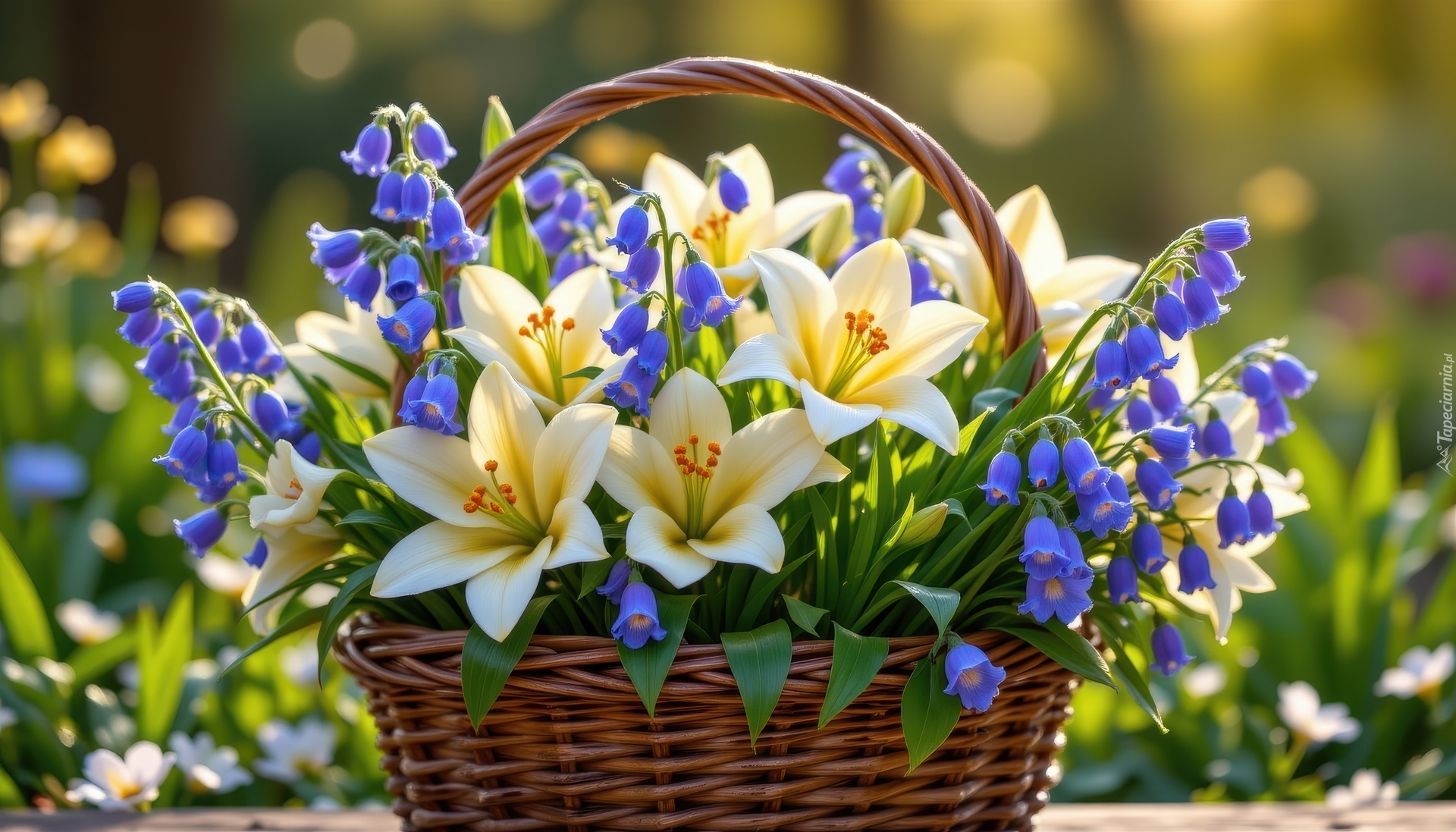 Edytor tapety: Kremowe lilie i fioletowe dzwonki w wiklinowym koszyku