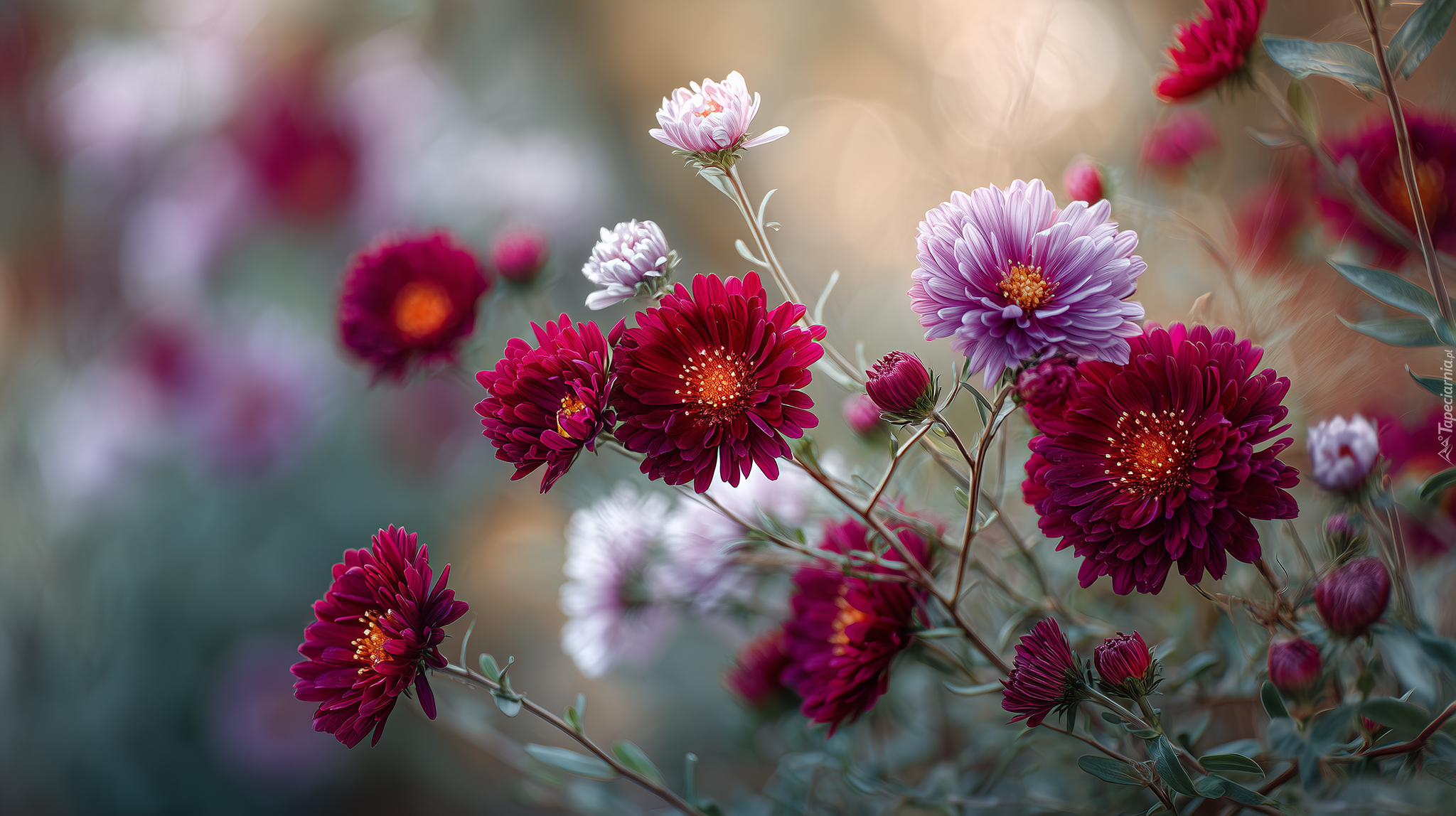 Edytor tapety: Bordowe i różowe astry na rozmytym tle