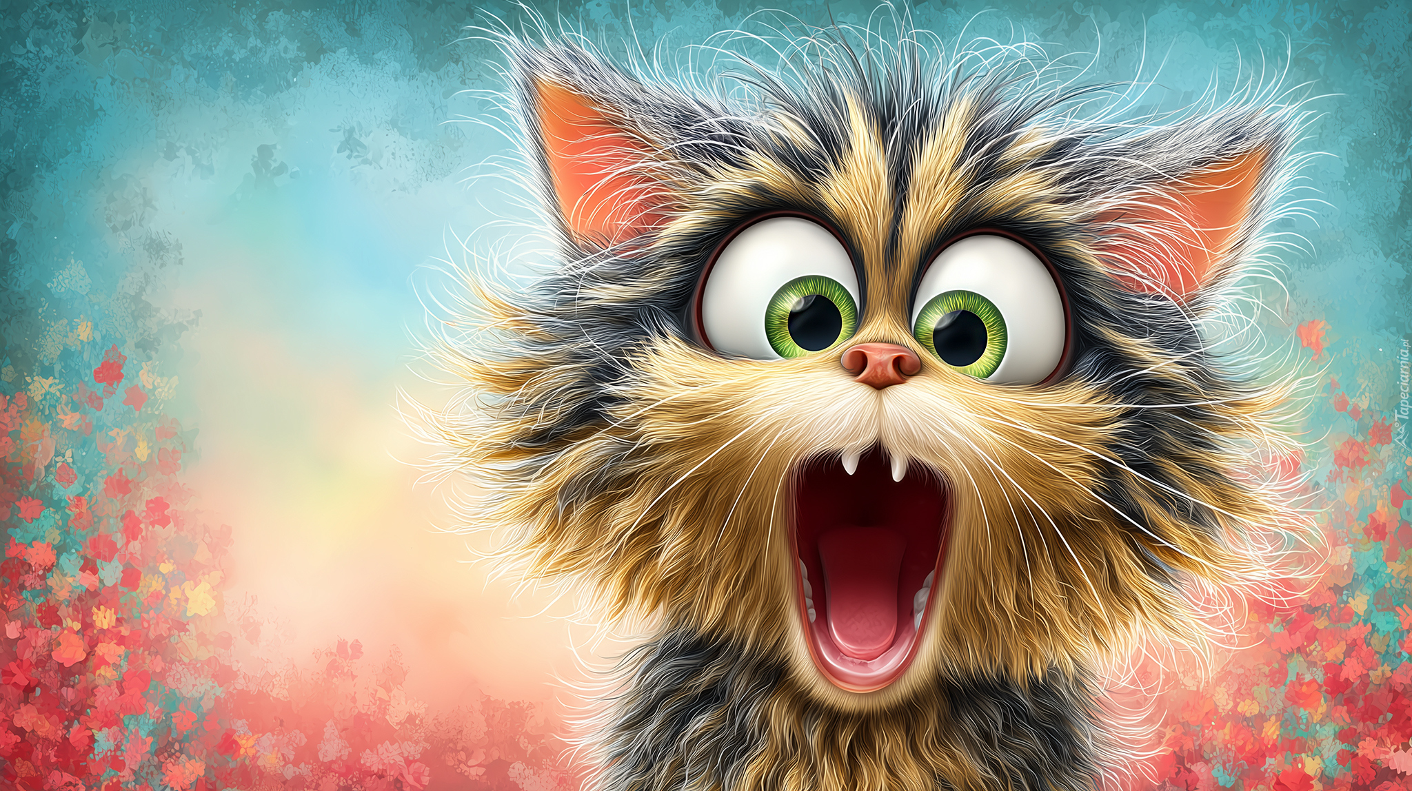 Edytor tapety: Zdziwiony kot z dużymi oczami w grafice