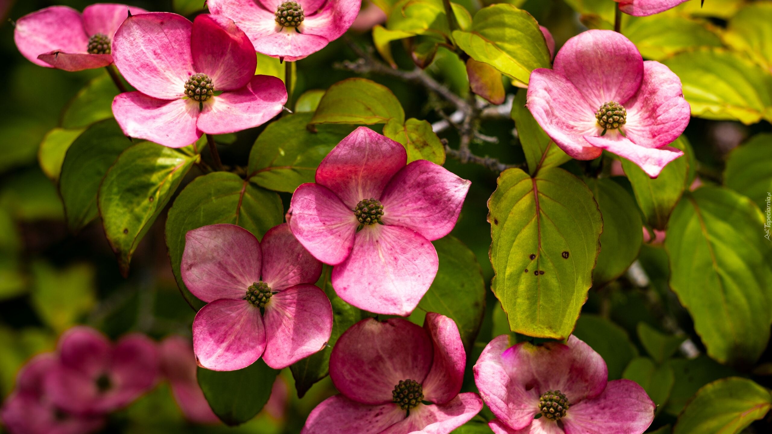Edytor tapety: Różowe kwiaty derenia na gałązkach krzewu