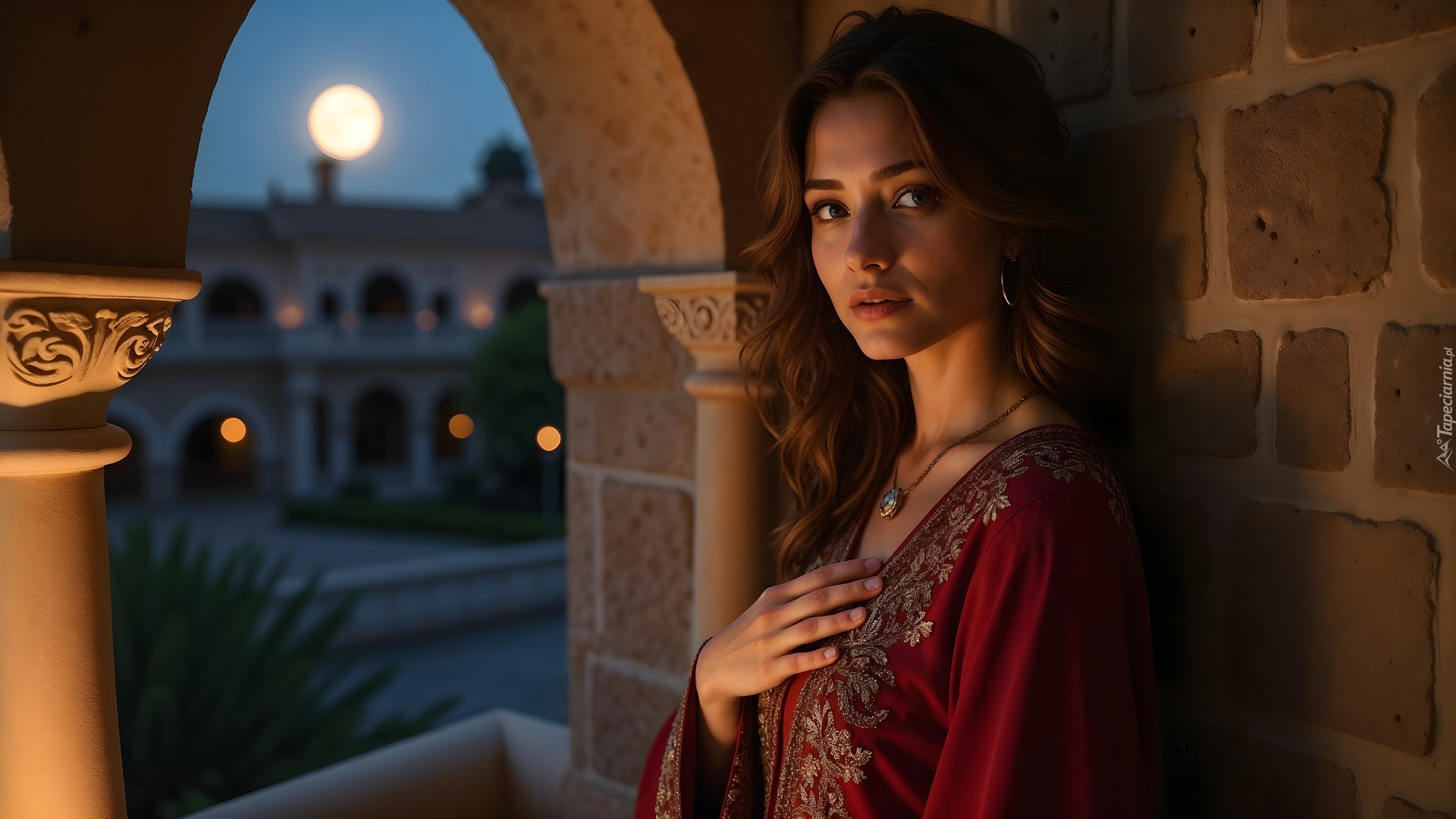Edytor tapety: Kobieta w czerwonej bluzce stojąca przy murze
