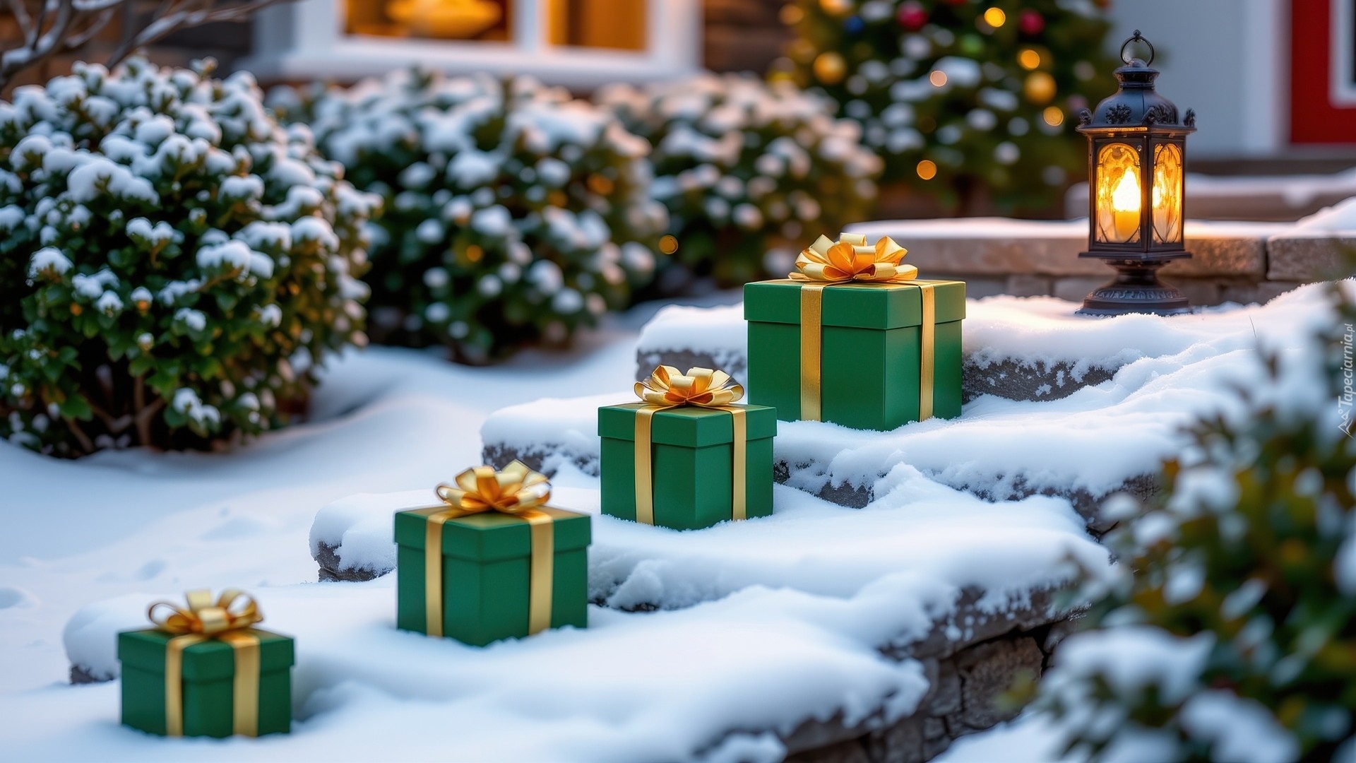 Edytor tapety: Prezenty i zapalony lampion na ośnieżonych schodach