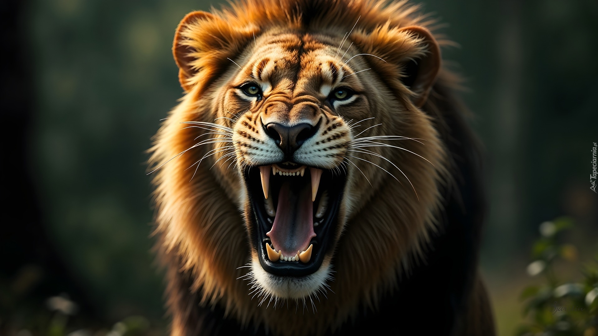 Edytor tapety: Głowa lwa z otwartą paszczą w zbliżeniu