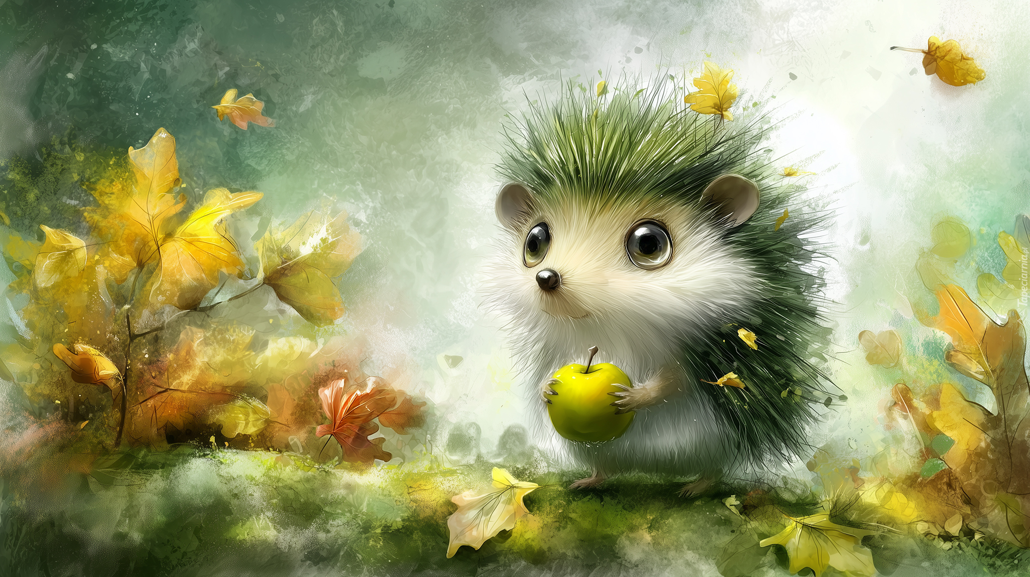 Edytor tapety: Jeż z jabłkiem wśród jesiennych liści w grafice