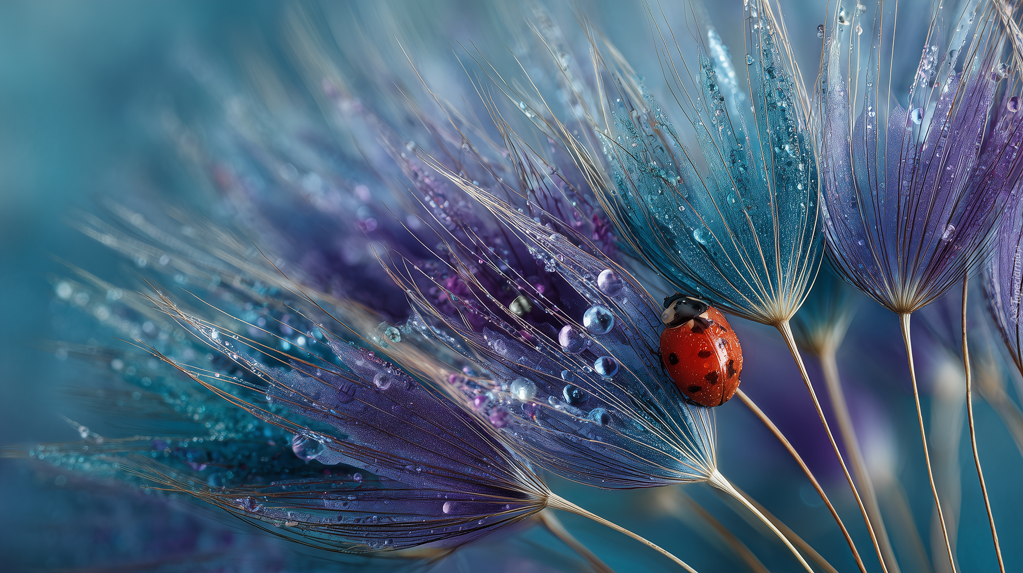 Edytor tapety: Biedronka na mokrych dmuchawcach w zbliżeniu