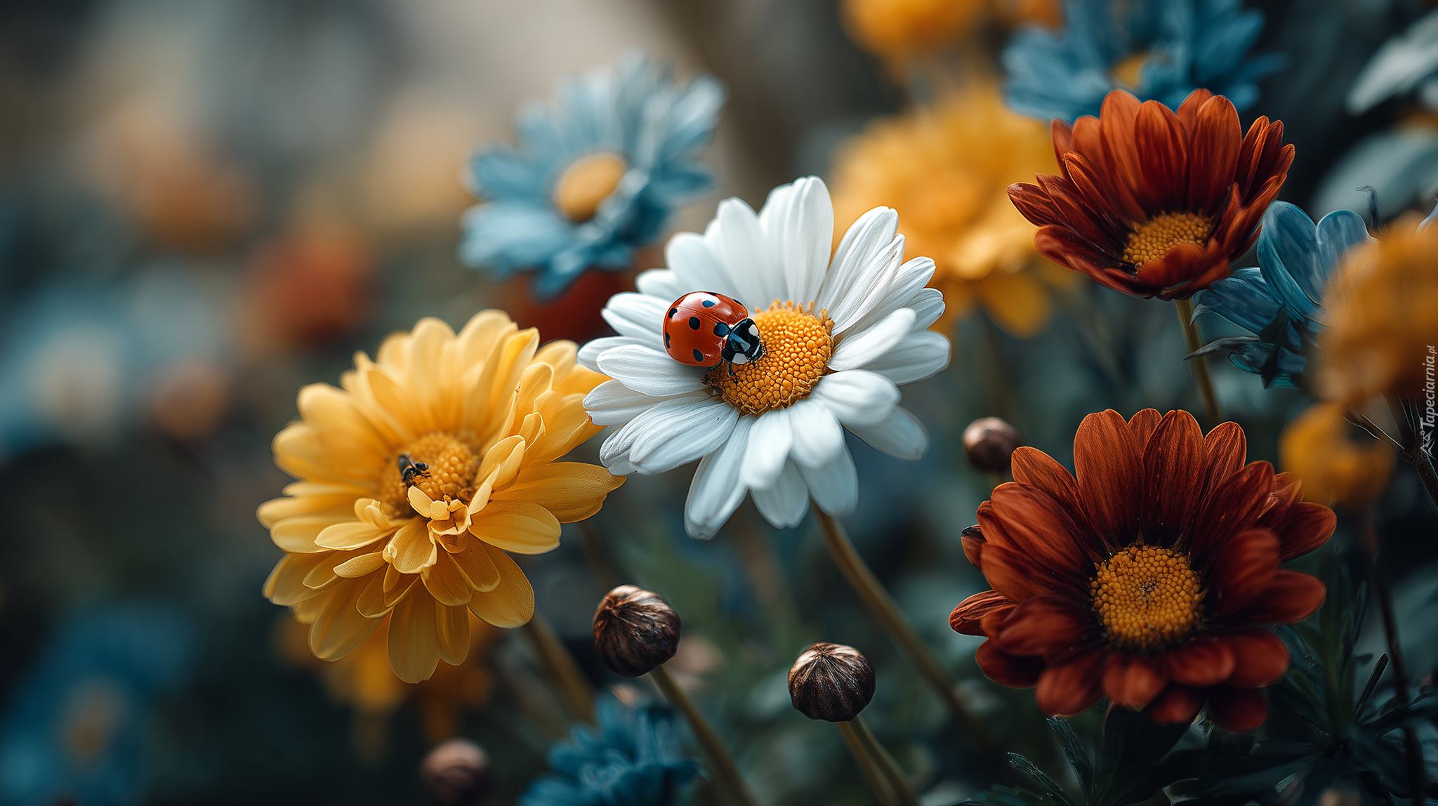 Edytor tapety: Grafika z biedronką i kolorowymi kwiatami
