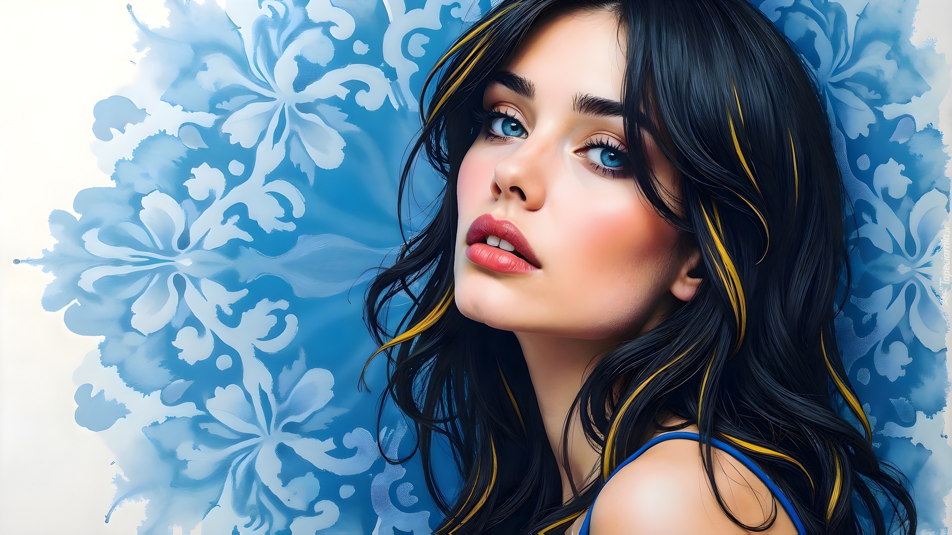 Edytor tapety: Niebieskooka brunetka na niebieskim tle w grafice