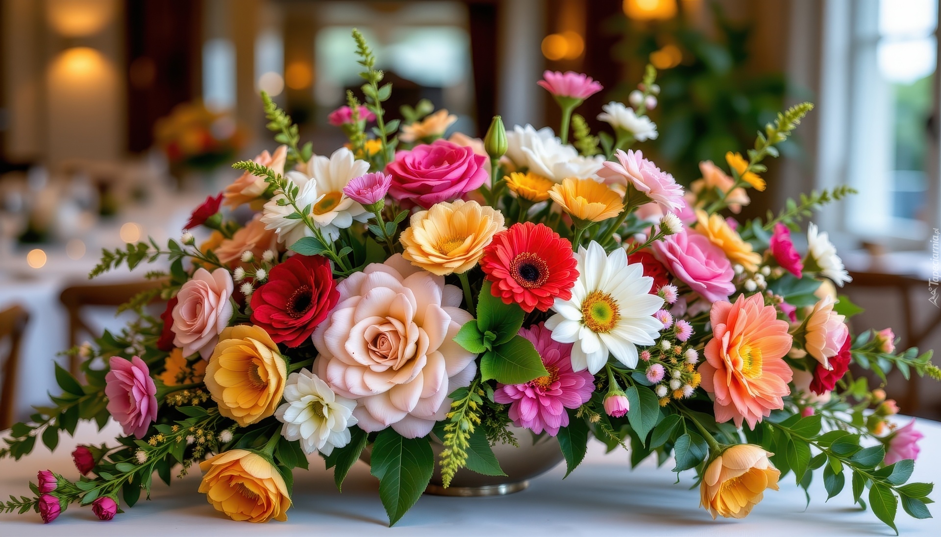 Edytor tapety: Bukiet z kolorowych kwiatów w wazie na stole