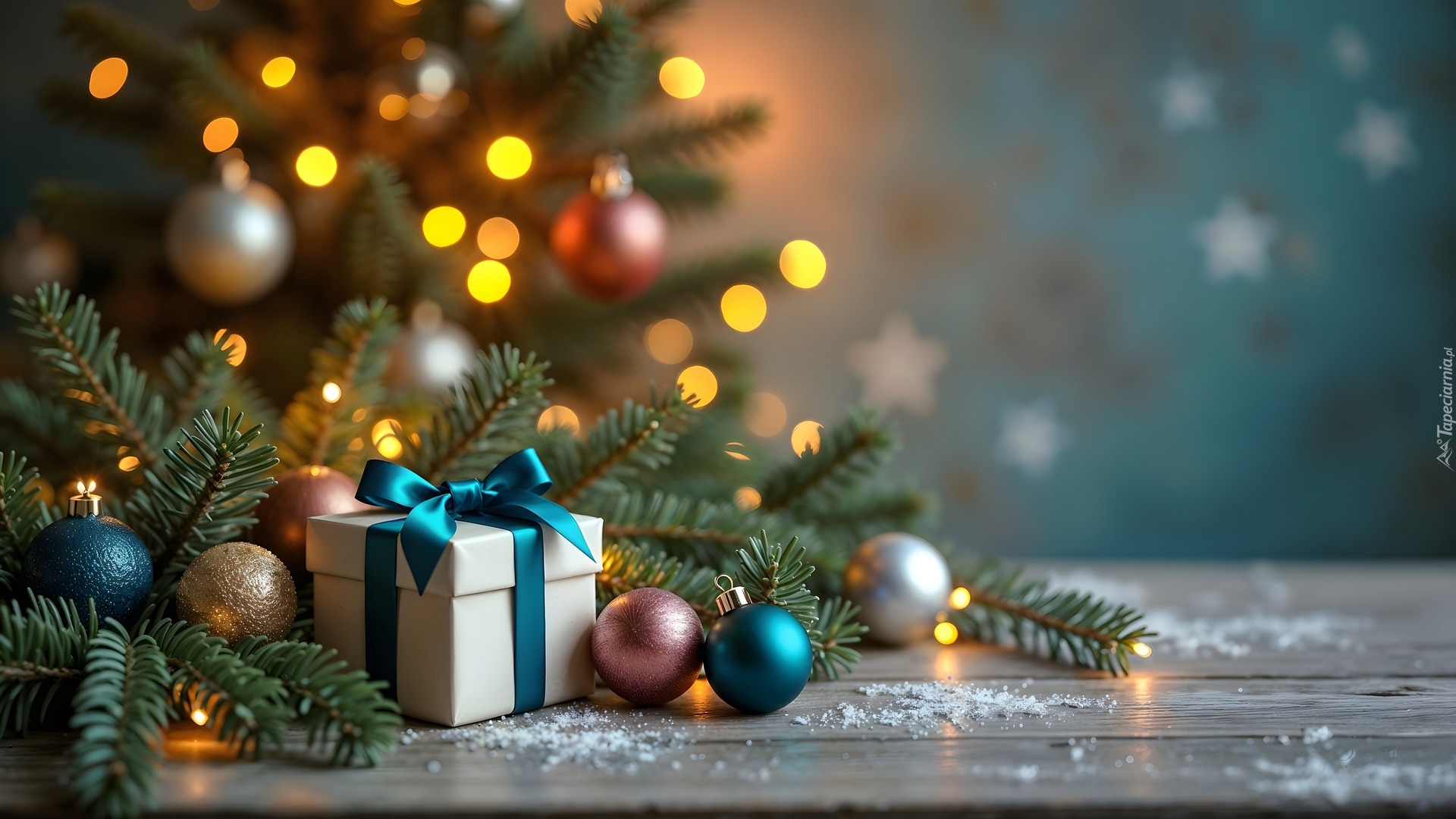 Edytor tapety: Prezent i bombki wśród iglastych oświetlonych sosnowych gałązek