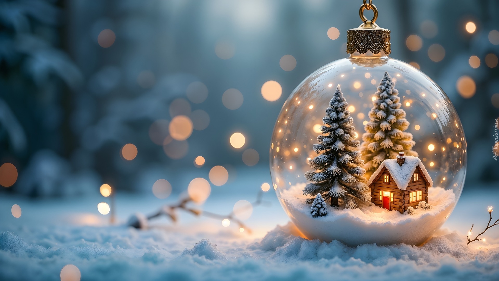 Edytor tapety: Choinki i domek w szklanej bombce na śniegu
