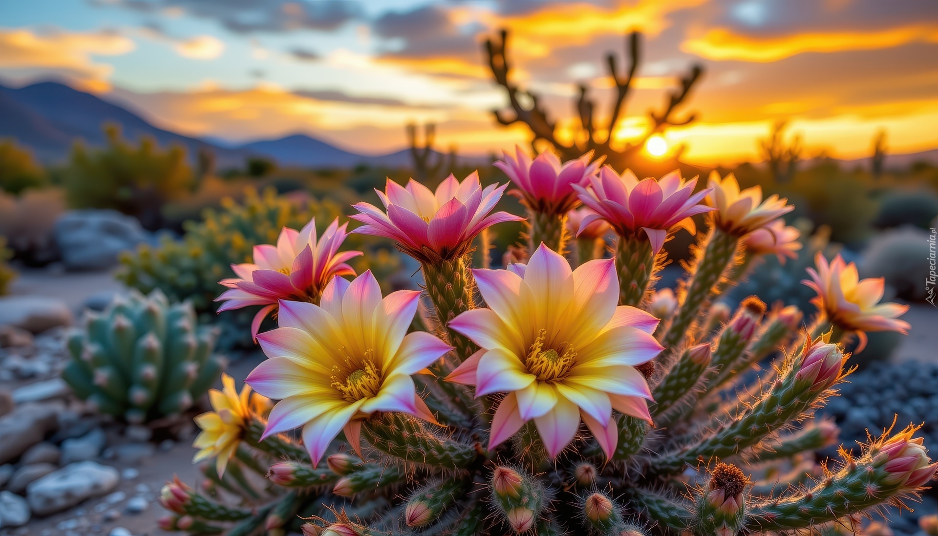 Edytor tapety: Kwitnący kaktus na tle kolorowego nieba zachodzącego słońca
