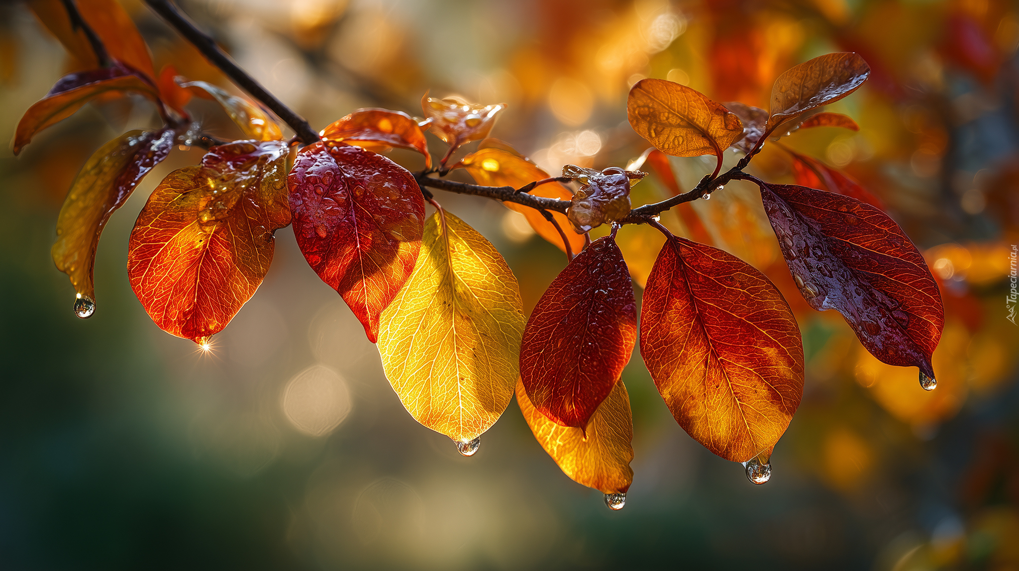Edytor tapety: Rozświetlone światłem mokre liście na gałązce