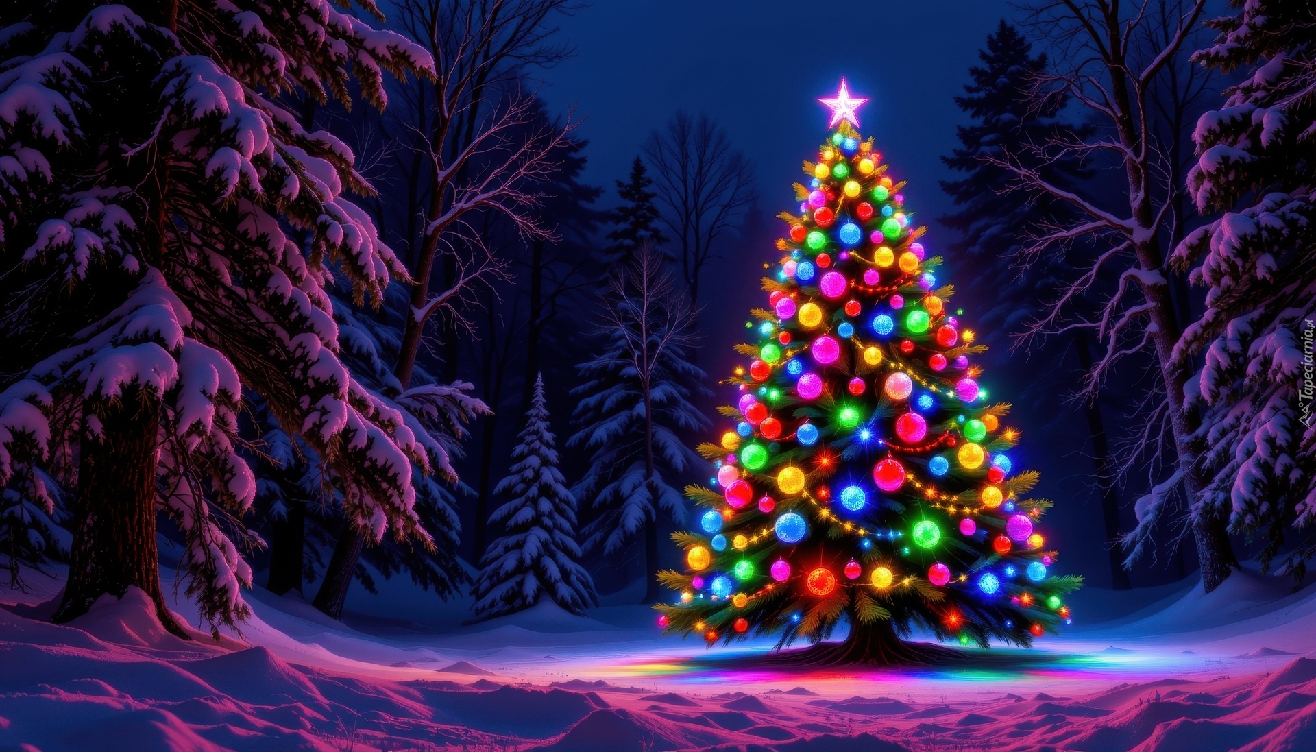 Edytor tapety: Udekorowana choinka w zimowym lesie nocną porą
